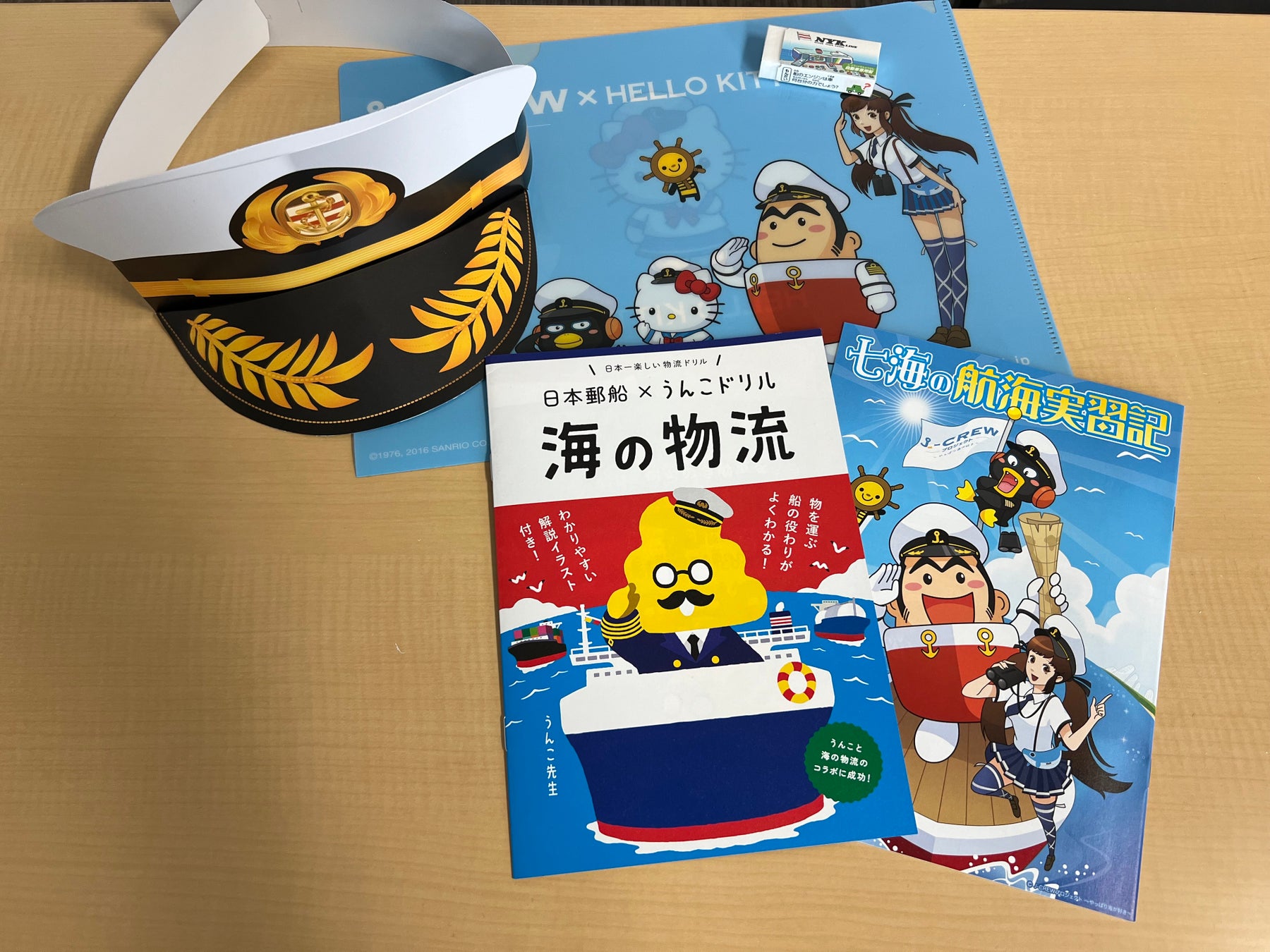 また、船長気分が味わえるサンバイザーや、外航海運と船員の仕事について楽しく学べる「うんこドリル 海の物流」、クリアファイルなどが記念品として手渡されました。