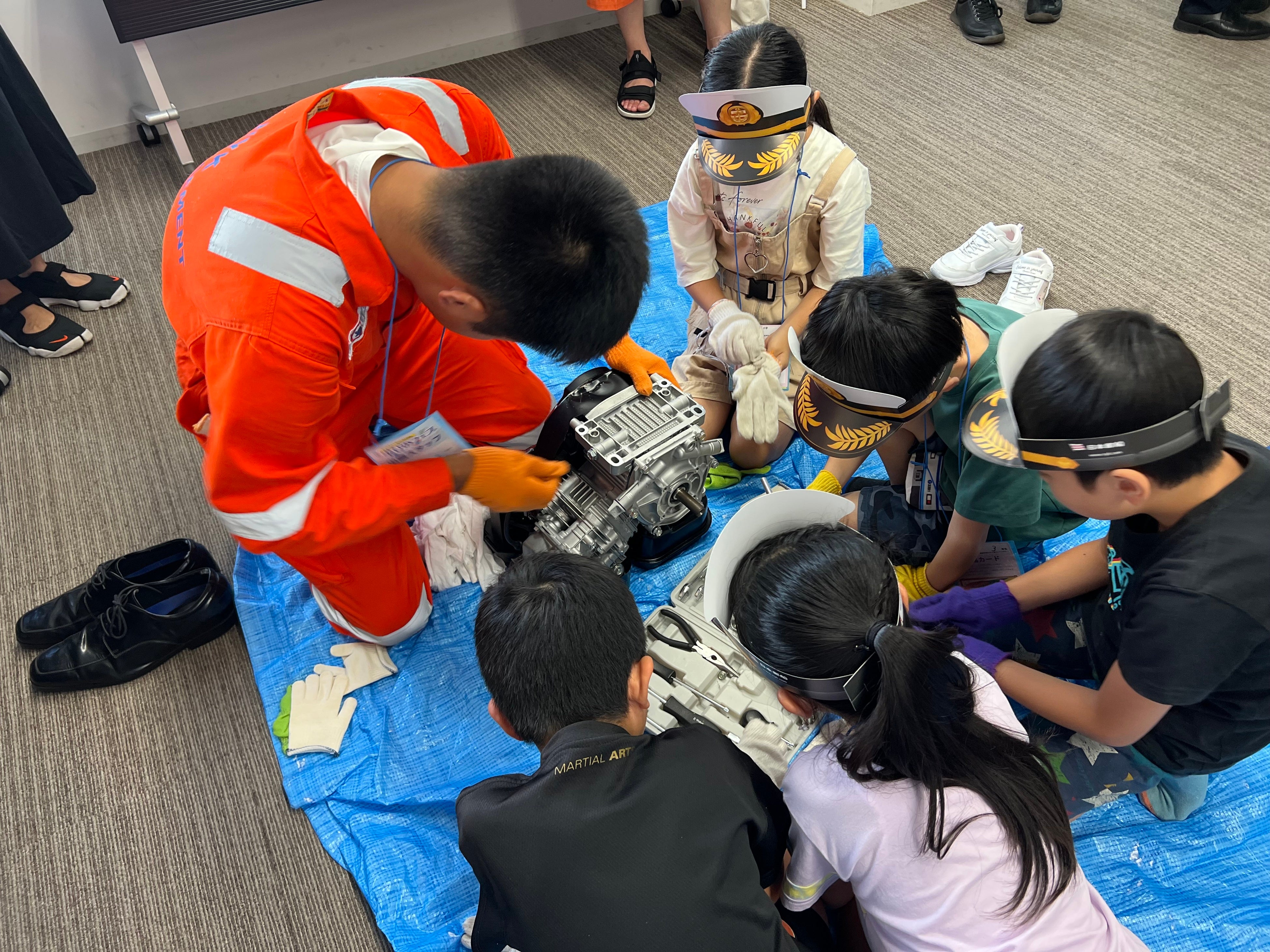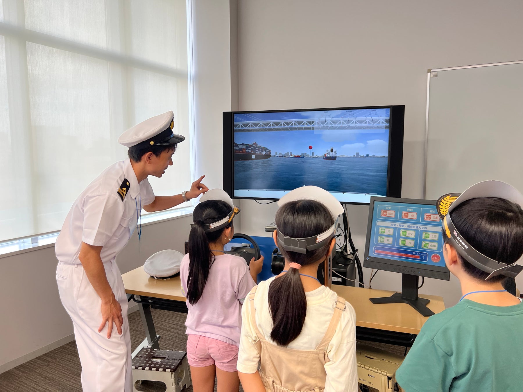 当日、子どもたちは海や船についての授業を受けたあと、航海士と一緒に操船シミュレータの操作を、機関士と一緒に小型のエンジン模型の分解・組み立てを体験しました。操船シミュレータでは横浜ベイブリッジからさん橋まで小型ボートを操船し、「船の針路を変えるのが難しかった」や「夜や嵐の設定で操船することが出来て面白かった」という感想がありました。また、小型エンジン模型の分解・組み立て体験では実際に船で使われている工具を用いてエンジンの開放作業を行い、「工具を使って分解するのが楽しかった」や「いろいろな工具に触れることができて楽しかった」という感想が聞かれました。