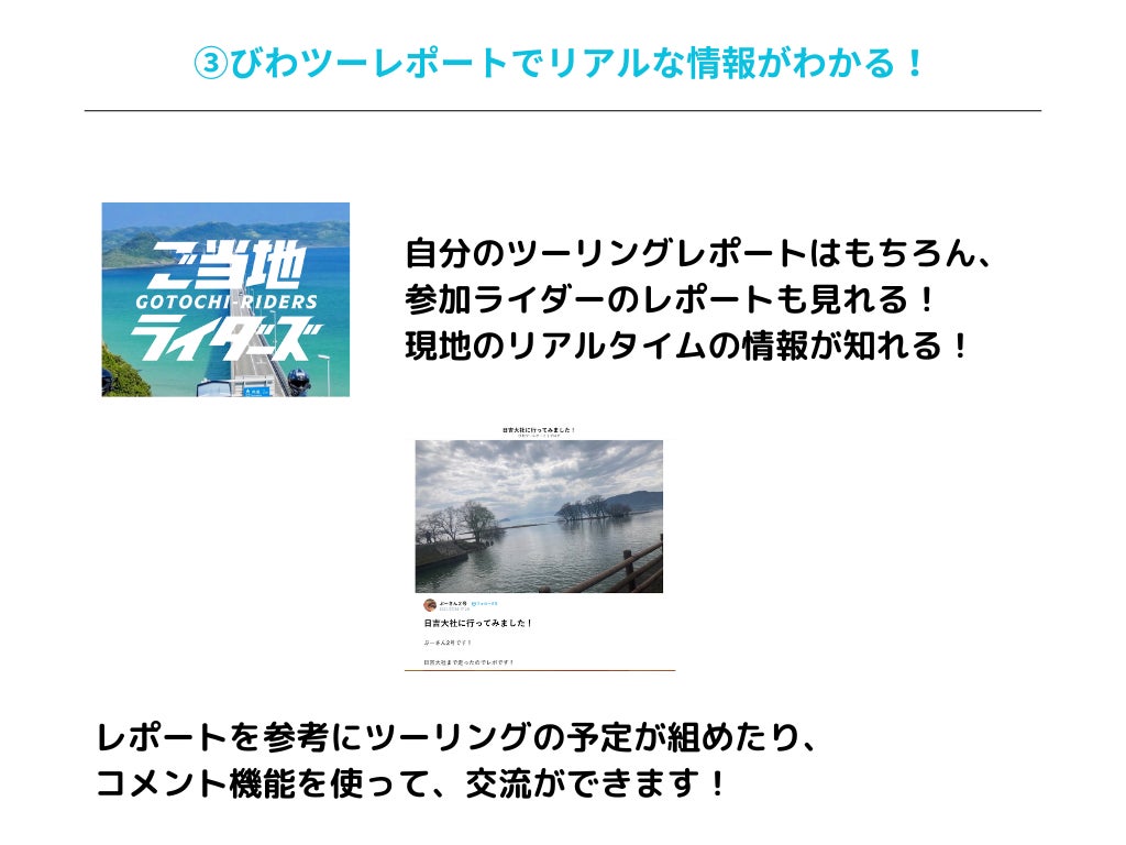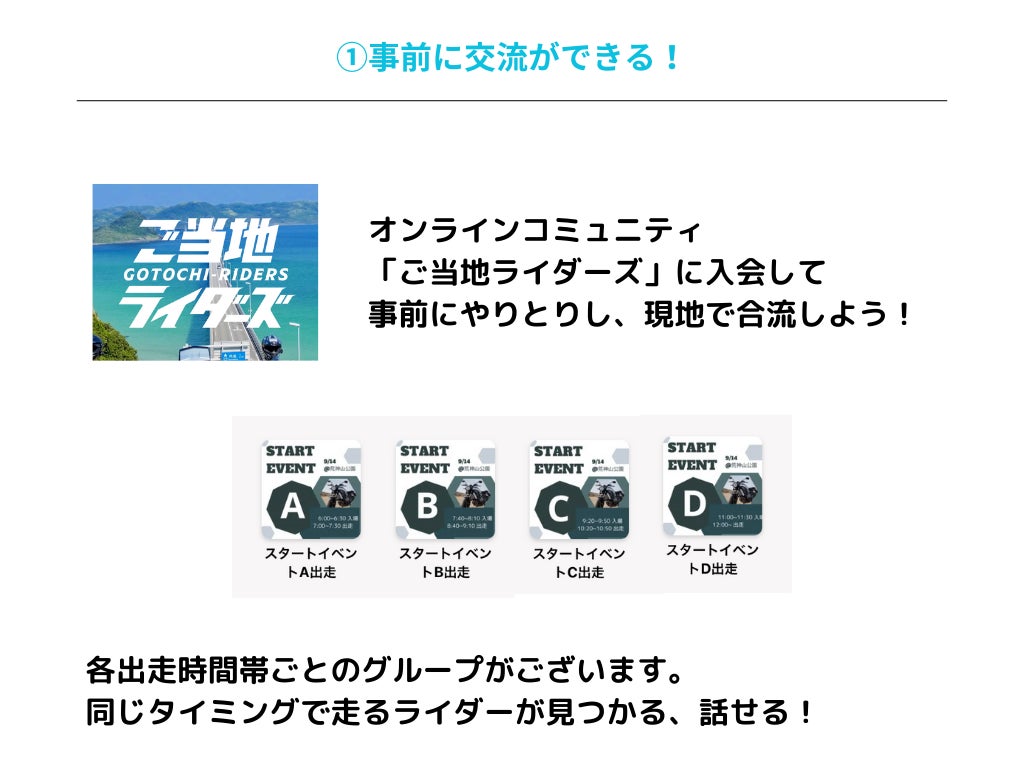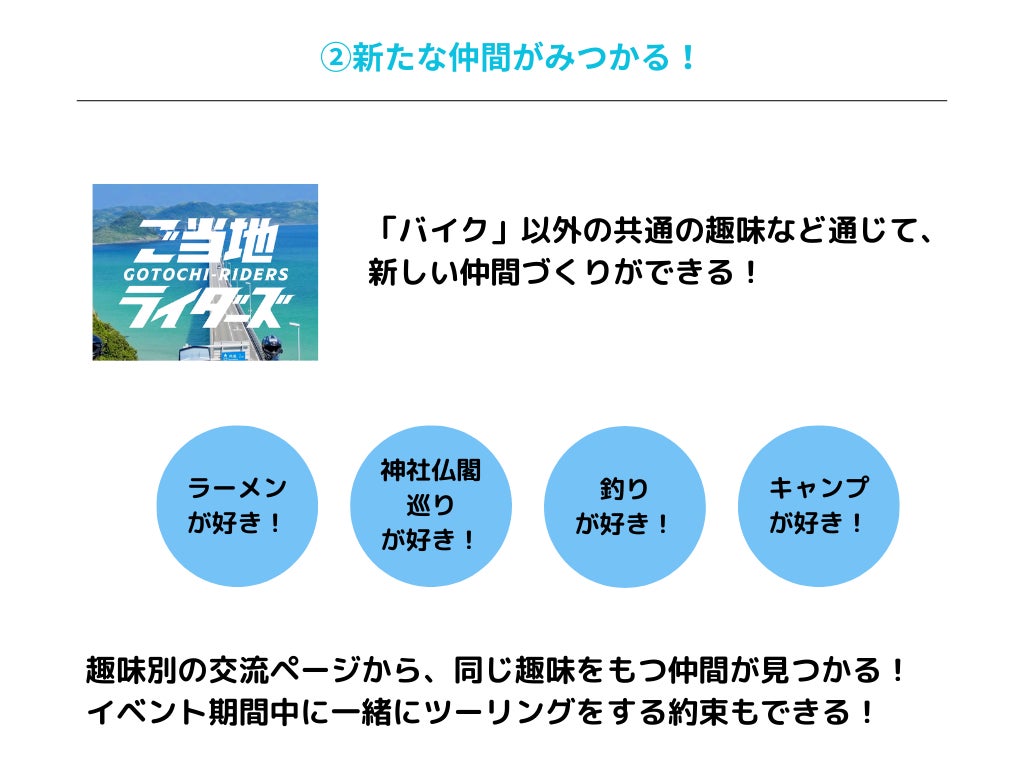 一緒に走る仲間を見つけたり、ご当地やバイクに関する情報交換などを通じて交流が楽しめます。