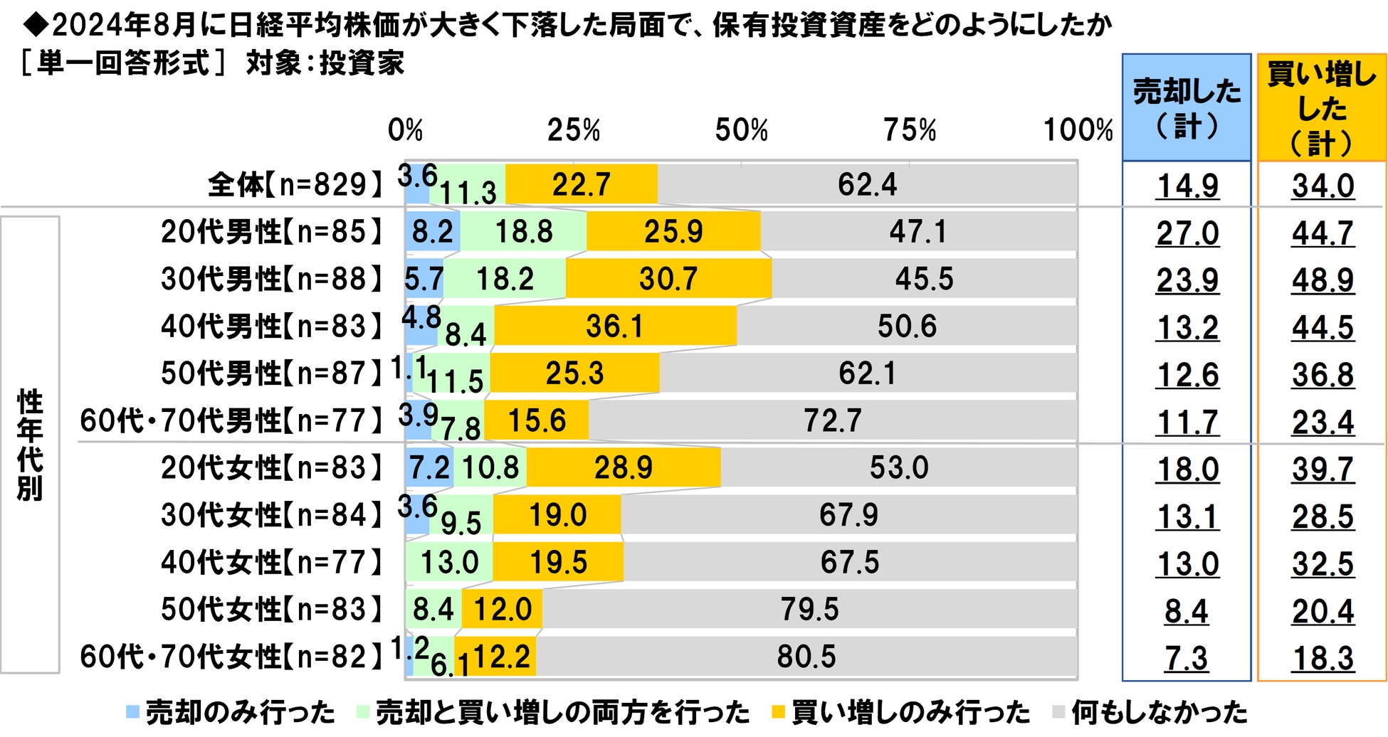投資家の34%が「日経平均株価が大きく下落した局面で保有投資資産を買い増しした」と回答