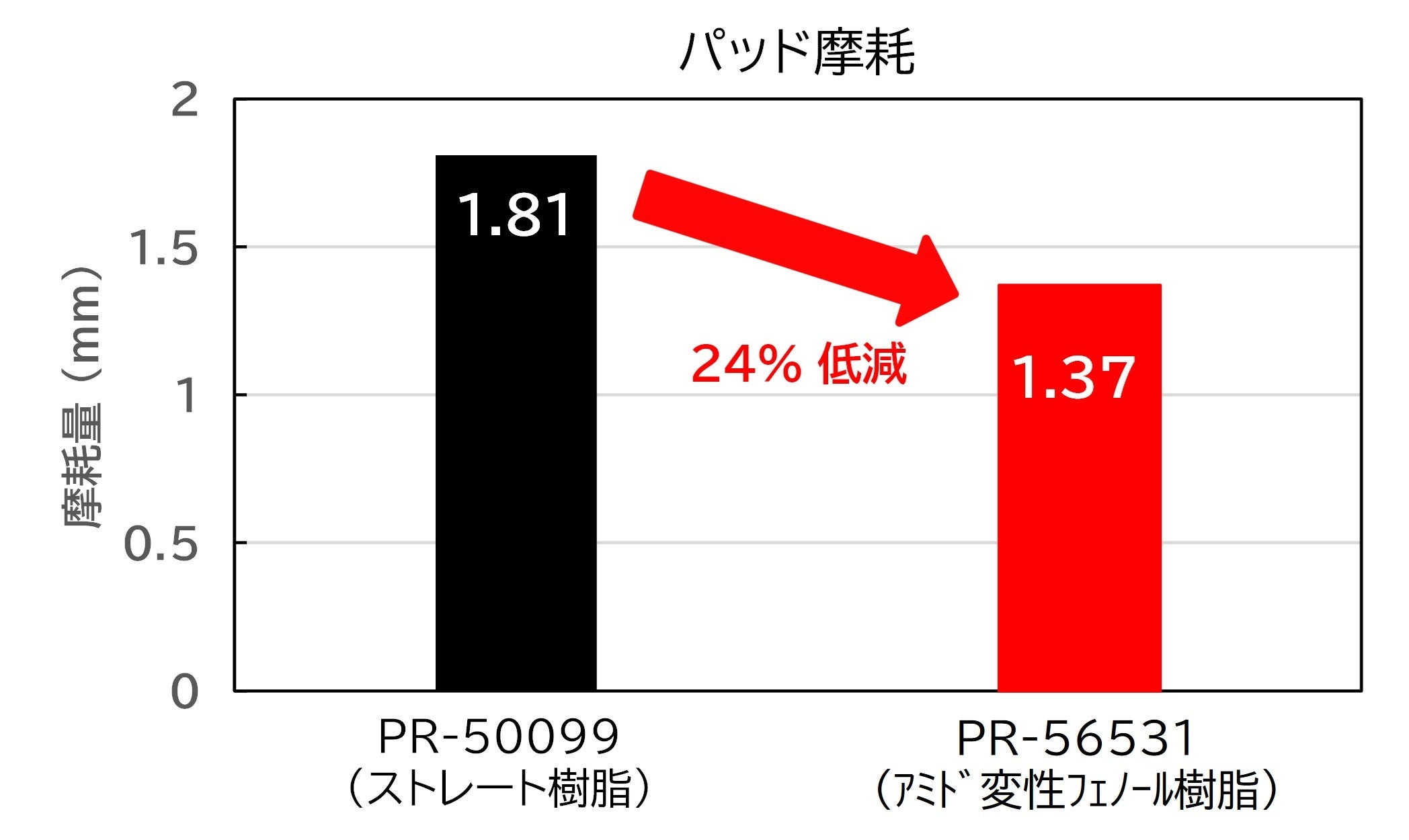 当社が開発した耐摩耗アミド変性フェノール樹脂「スミライトレジン® PR-56531」は、ブレーキパッドの耐摩耗特性の向上に寄与します。当社内で実施したブレーキパッドモデル配合成形体のダイナモ試験において、未変性フェノール樹脂(ストレート樹脂)に比べて摩耗量が24%低減することを確認しました。(図参照)