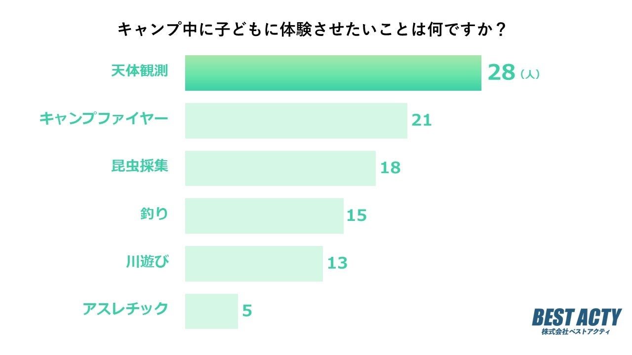 キャンプ中に子どもに体験させたいことについて100名にアンケートを行ったところ、「天体観測」と回答する人が最も多い結果となりました。