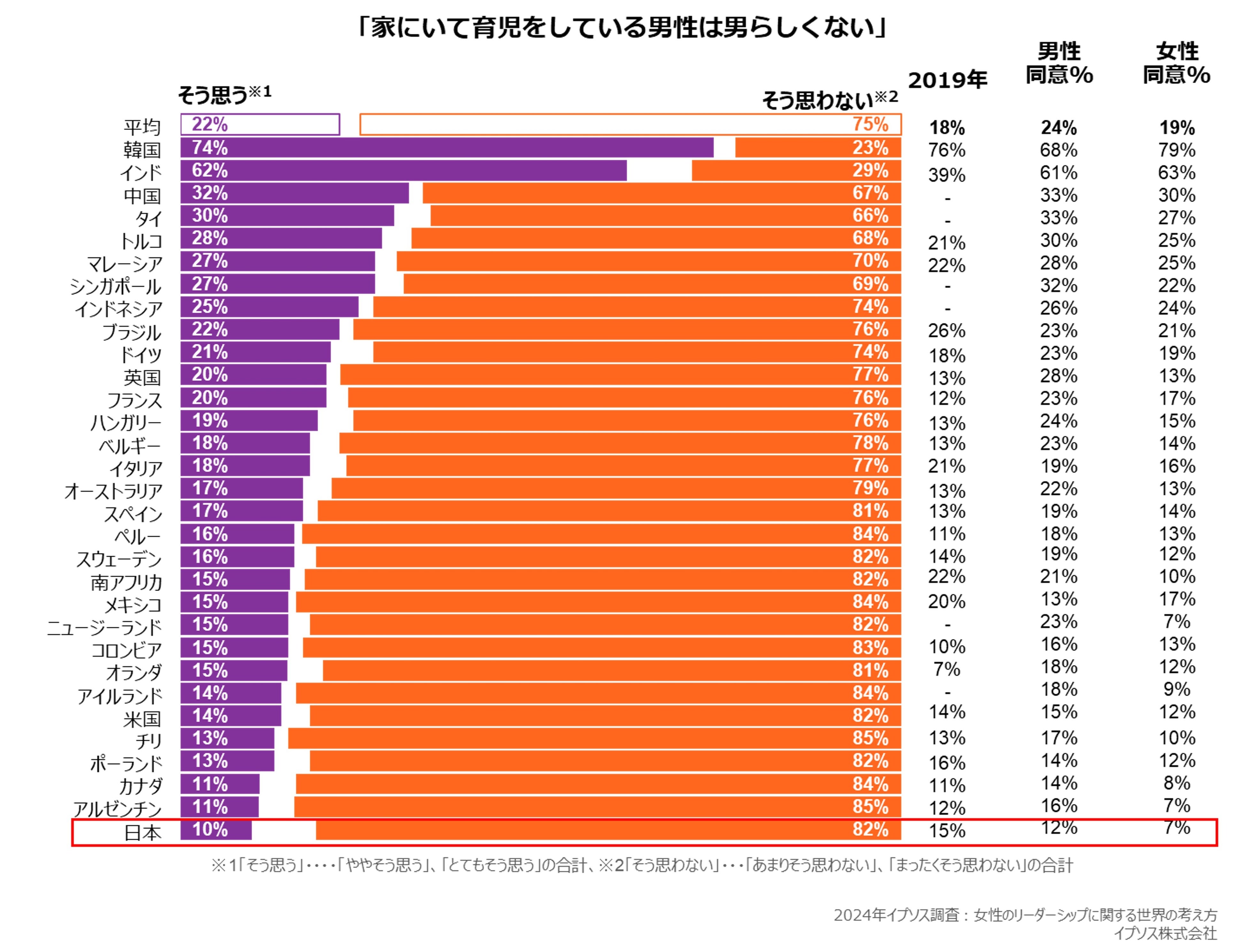 「家にいて育児をしている男性は男らしくない」と考える日本人は10%~調査31カ国中最も少なく、5年間で5%減少~