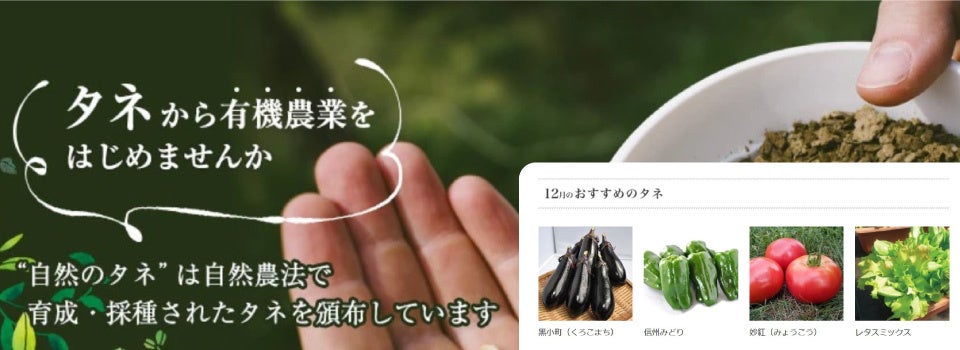 有機栽培や自然農法向けに、日本の風土で育まれた「国産」、「農薬や化学肥料を使わず」育てたタネと苗を今シーズンも販売開始しました。春の菜園計画や栽培計画にむけて是非ご活用ください。