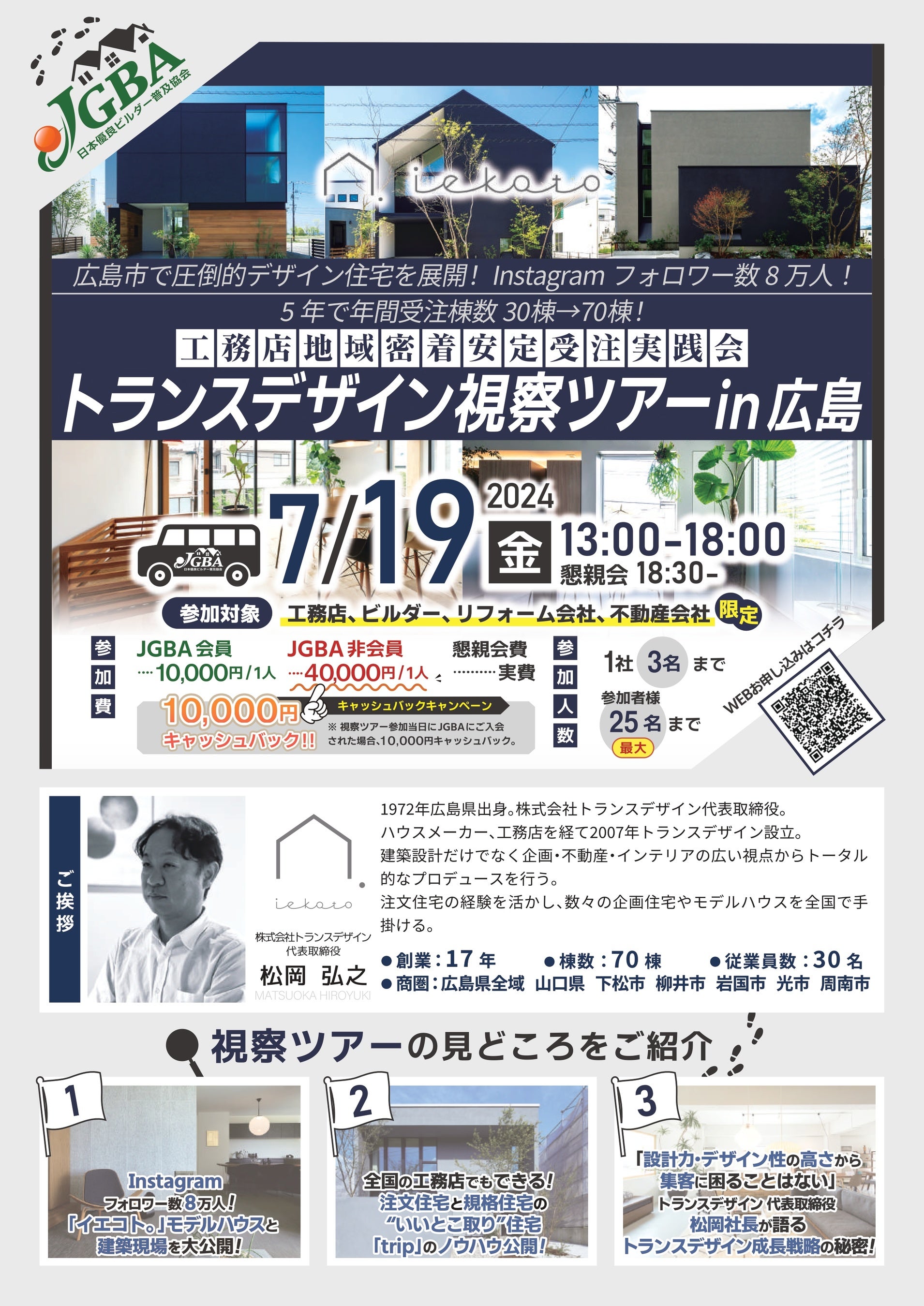 今回の視察ツアー開催企業は広島県広島市で圧倒的デザイン住宅を展開しており、Instagramフォロワー数は8万人、5年で年間受注棟数30棟から70棟アップを実現した、株式会社トランスデザイン(本社:広島県広島市、代表取締役:松岡弘之)で決定しており、同社の事務所や店舗、モデルハウスといった施設を実際に視察する予定となっております。2024年7月19日(金)に開催が決定しており、会員企業に問わず全国の工務店、住宅会社が参加予定です。