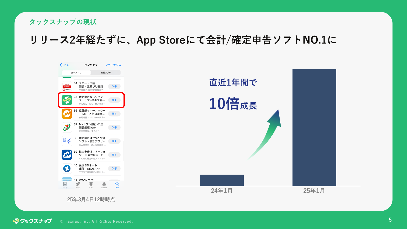 昨年度の確定申告では確定申告アプリNO.1になり、直近1年間では登録会員数が10倍に成長しております。