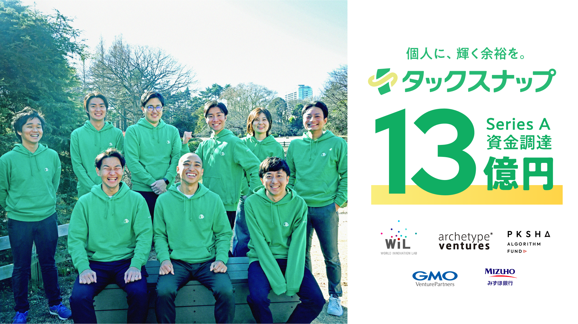 頑張らなくていい確定申告アプリ「タックスナップ」を提供する株式会社タックスナップ(本社:東京都杉並区、代表取締役:田中雄太、以下「当社」)は、WiL(World Innovation Lab)をリード投資家として既存株主・新規投資家を引受先とした第三者割当増資に加え、みずほ銀行をはじめとする金融機関からの融資により、シリーズAラウンドにて総額13億円の資金調達を実施しました。これにより累計調達額は約16億円となります。