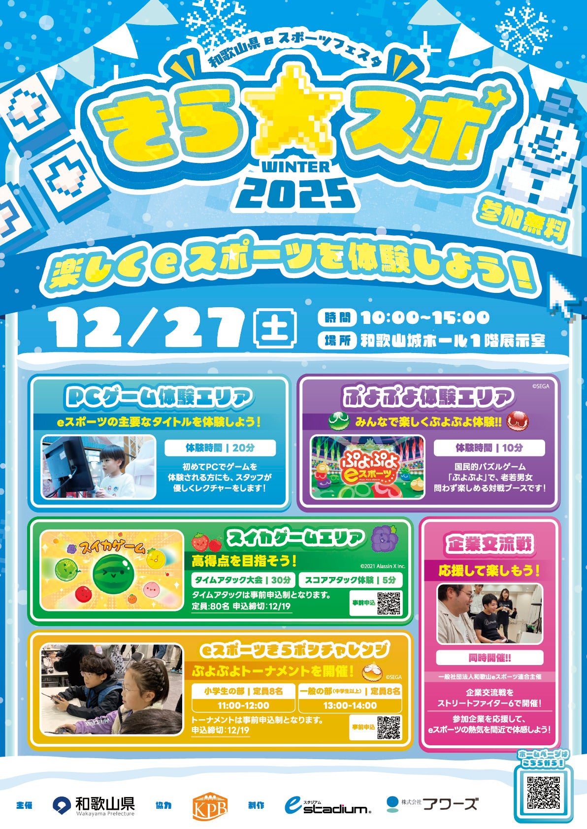 2025年12月27日(土)開催予定の『和歌山県 e スポーツフェスタ「きら★スポ」 Winter 2025』は、スイカゲームや PC ゲーム体験、ぷよぷよ体験、ぷよぷよ e スポ ーツ大会「キラボシチャレンジ」など、多彩なプログラムを通じて、子どもから高齢者まで多世代が e スポーツに親しみ、交流できる場を提供します。