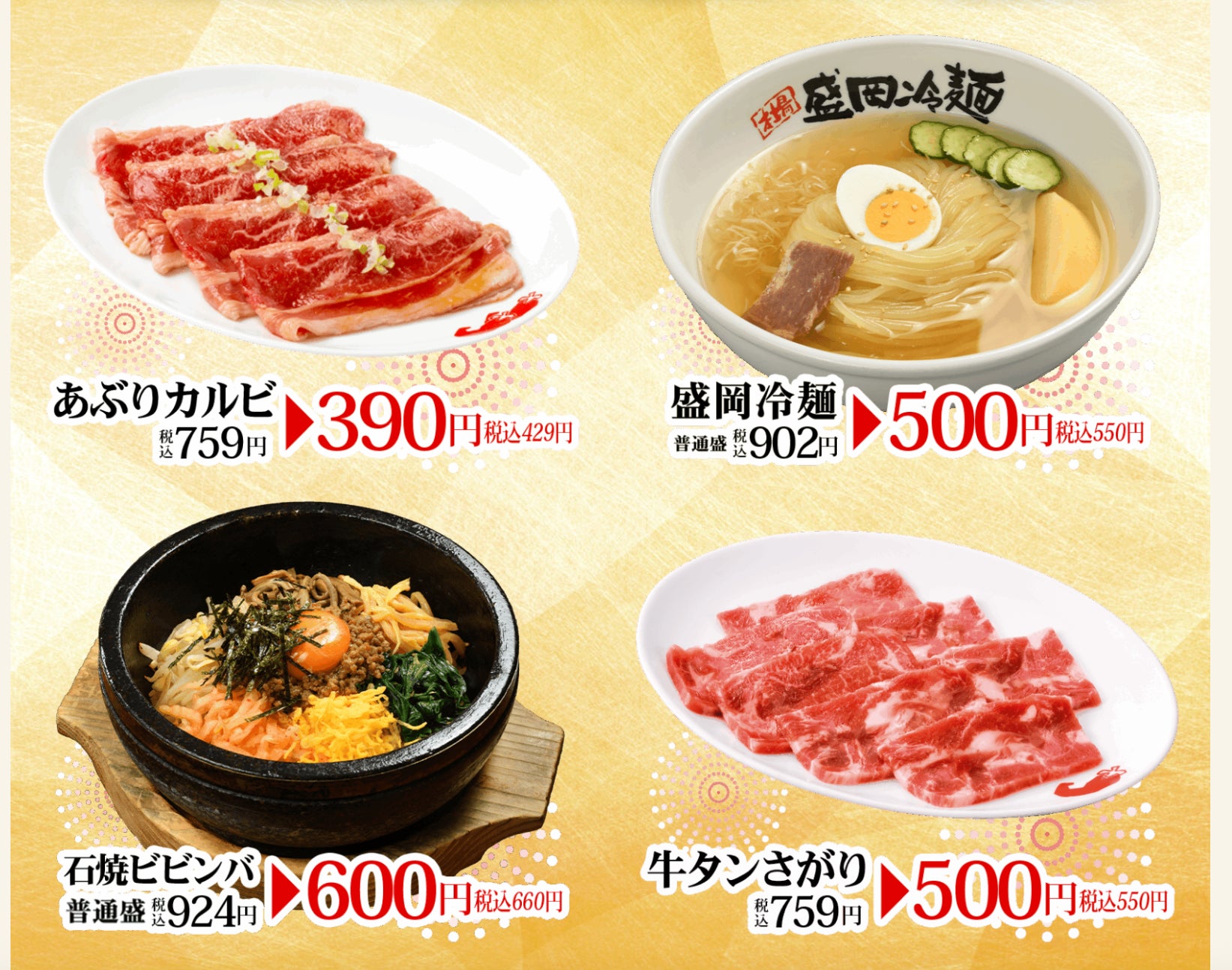 ◆対象商品:・あぶりカルビ(390円/税込429円)・盛岡冷麺 [普通盛](500円/税込550円)・石焼ビビンバ[普通盛](600円/税込660円)・牛タンさがり(500円/税込550円)・鶏セセリ(500円/税込550円)・生中ジョッキ(400円/税込440円)・角ハイボール(350円/税込385円)など