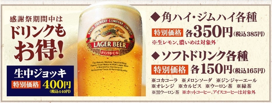 感謝祭期間中は、ドリンクを気軽にお楽しみいただける特別価格にてご提供します。生中ジョッキはなんと!1杯440円(税込)!焼肉や盛岡冷麺と相性抜群の一杯をお楽しみください。
