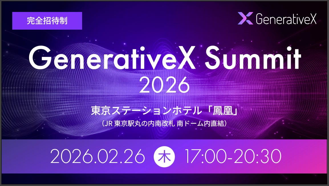 株式会社GenerativeX(本社:東京都千代田区、代表取締役CEO:荒木 れい、以下「当社」)は、生成AIの企業活用最前線に取り組む方々の情報交換とネットワーキングを目的とした完全招待制のカンファレンス「GenerativeX Summit 2026」を2026年2月26日(木)に東京ステーションホテルにて開催いたします。