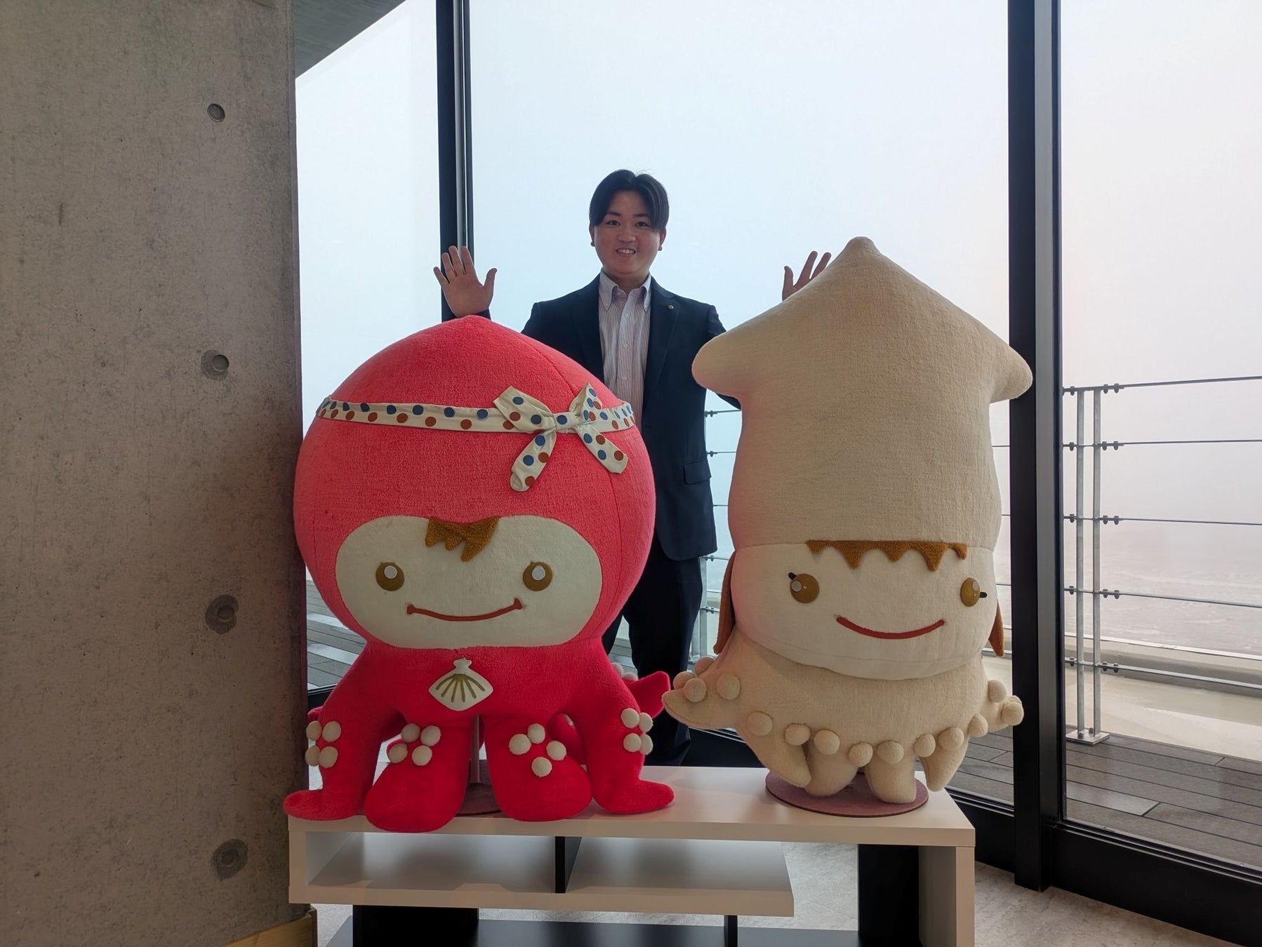 2階には展望デッキがありますので、ぜひ上がってみてください。「コイタくんとメイカちゃん」が揃ってお出迎えします。コイタくんは白糠生まれの柳だこ、メイカちゃんは九州のスルメイカです。日本の北と南の離れた場所で生まれたふたりが、運命の赤い糸に導かれて、恋問海岸で恋に落ちたというストーリーがあるんですよ。ぜひ一緒に記念写真をどうぞ!