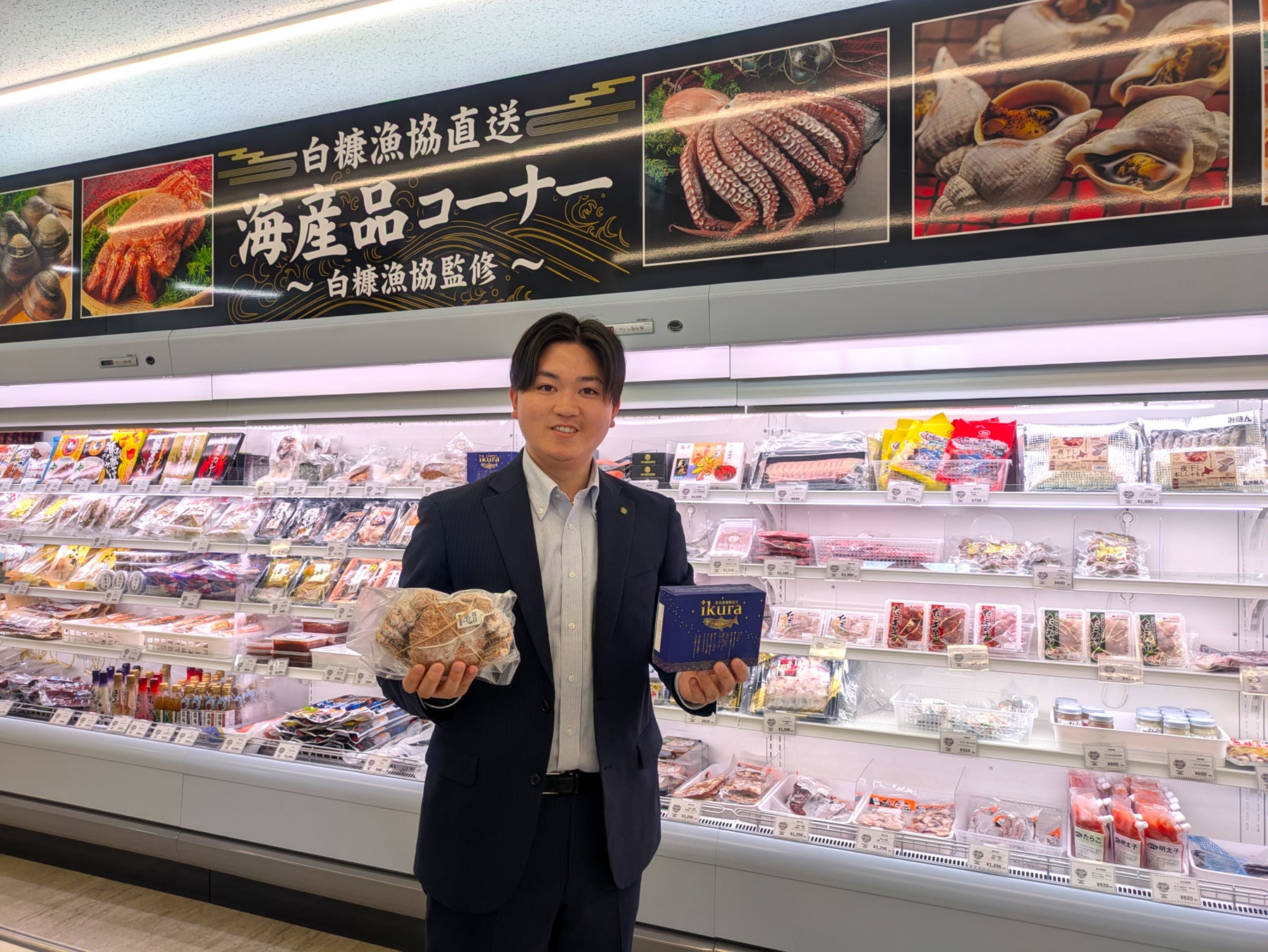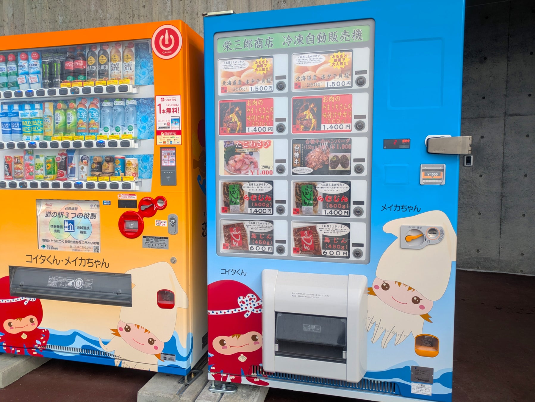 ユニークなのは、楽天で人気の白糠町通販サイト「栄三郎商店」の冷凍食品を購入できる自動販売機!ホタテ貝柱など、一部商品はこの自販機でしか買えません。