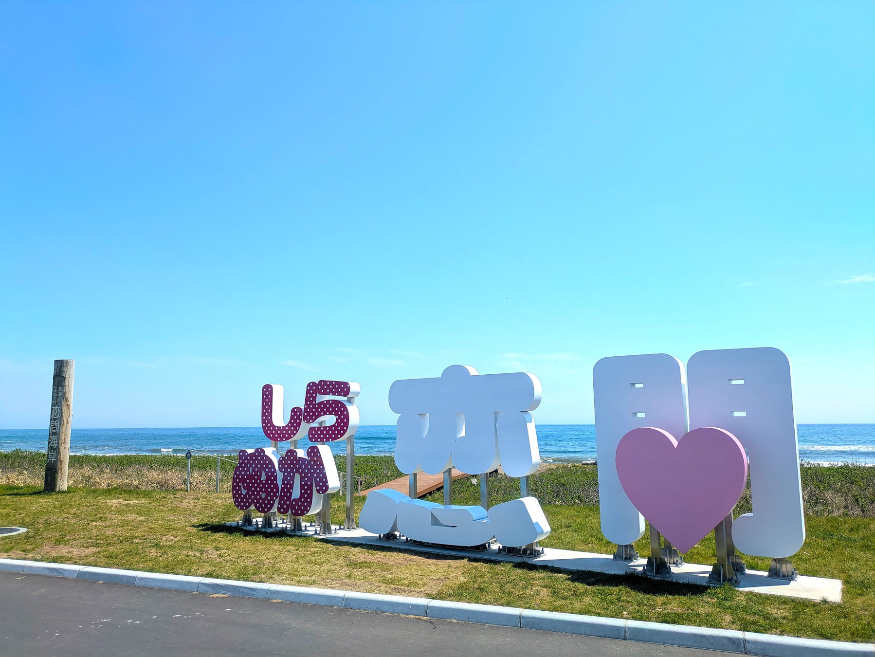 まずは「しらぬか 恋問館」の大きなモニュメント。こちらは海をバックに撮影ができます。