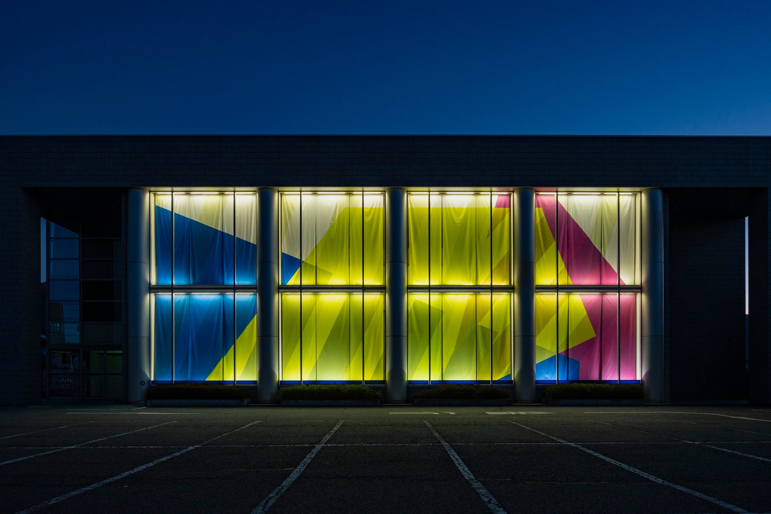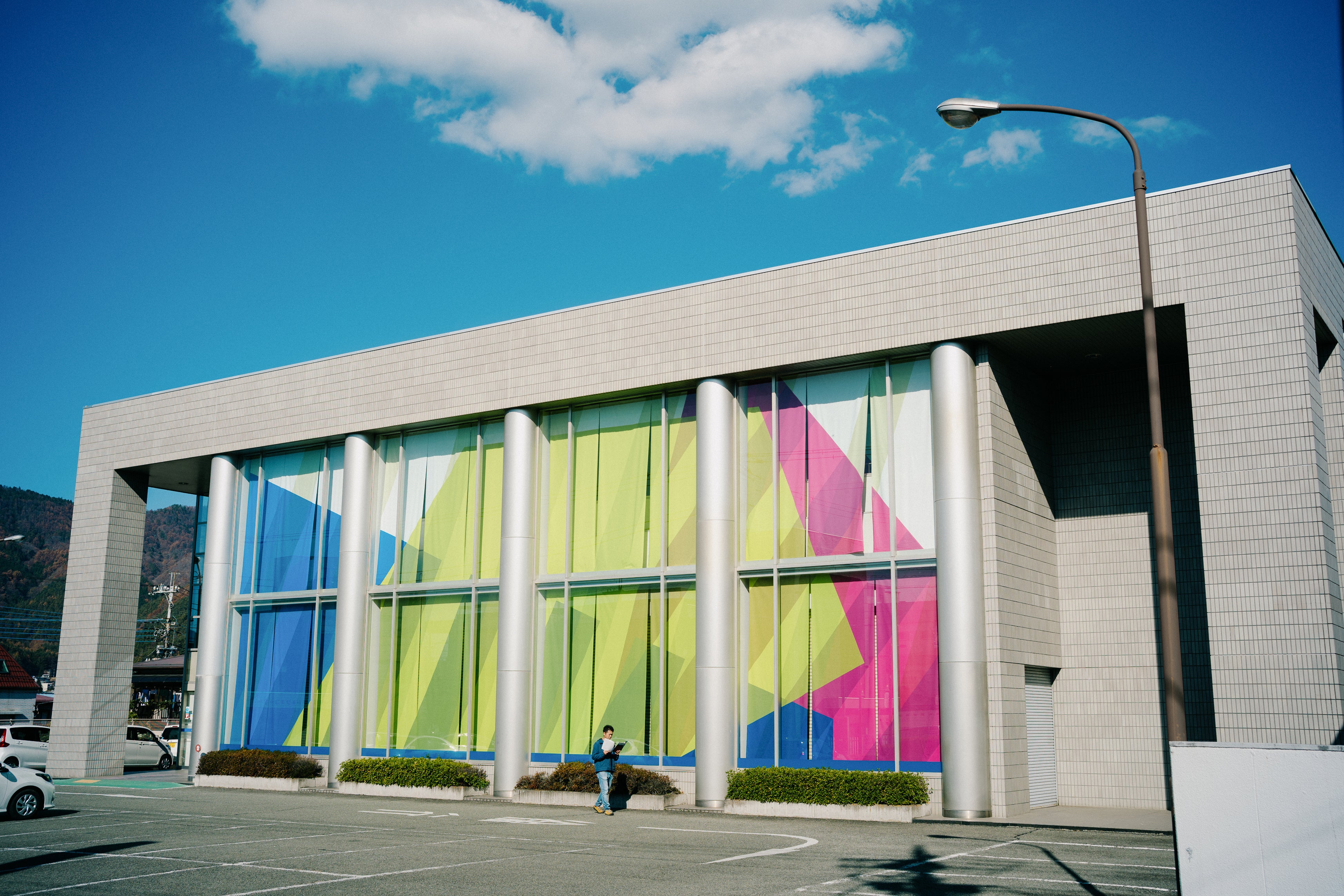 ご好評につき、鈴木マサルの作品《Everyday Patterns,Festive Colors》については2026年5月29日(金)まで展示の延長が決定しました。本作は、国内外の様々なブランドからテキスタイルプロダクトを発表し、テキスタイル以外にも家具や建築空間など様々なシーンに向けパターンデザインや自身のテキスタイルを軸にしたデザインを展開している鈴木マサルが、市民や地元企業の人々にとっての節目に立ち会ってきた銀行という場所を華やかに彩ることで、そこを訪れる人たちにエールを送るような作品にしたいという思いから山梨中央銀行との連携が実現したものです。高さ10m×横幅20mにもなる山梨中央銀行吉田支店のガラス面全面に色鮮やかなプリントファブリックのカーテンがかかる、同氏にとっても今までで最大規模の壁面サイズとなる大型展示です。銀行を訪れる人や街を行き交う人に対して、目に触れる街の景観を変えることで、アートやテキスタイルに意識を向けてもらいたいという狙いも込めています。