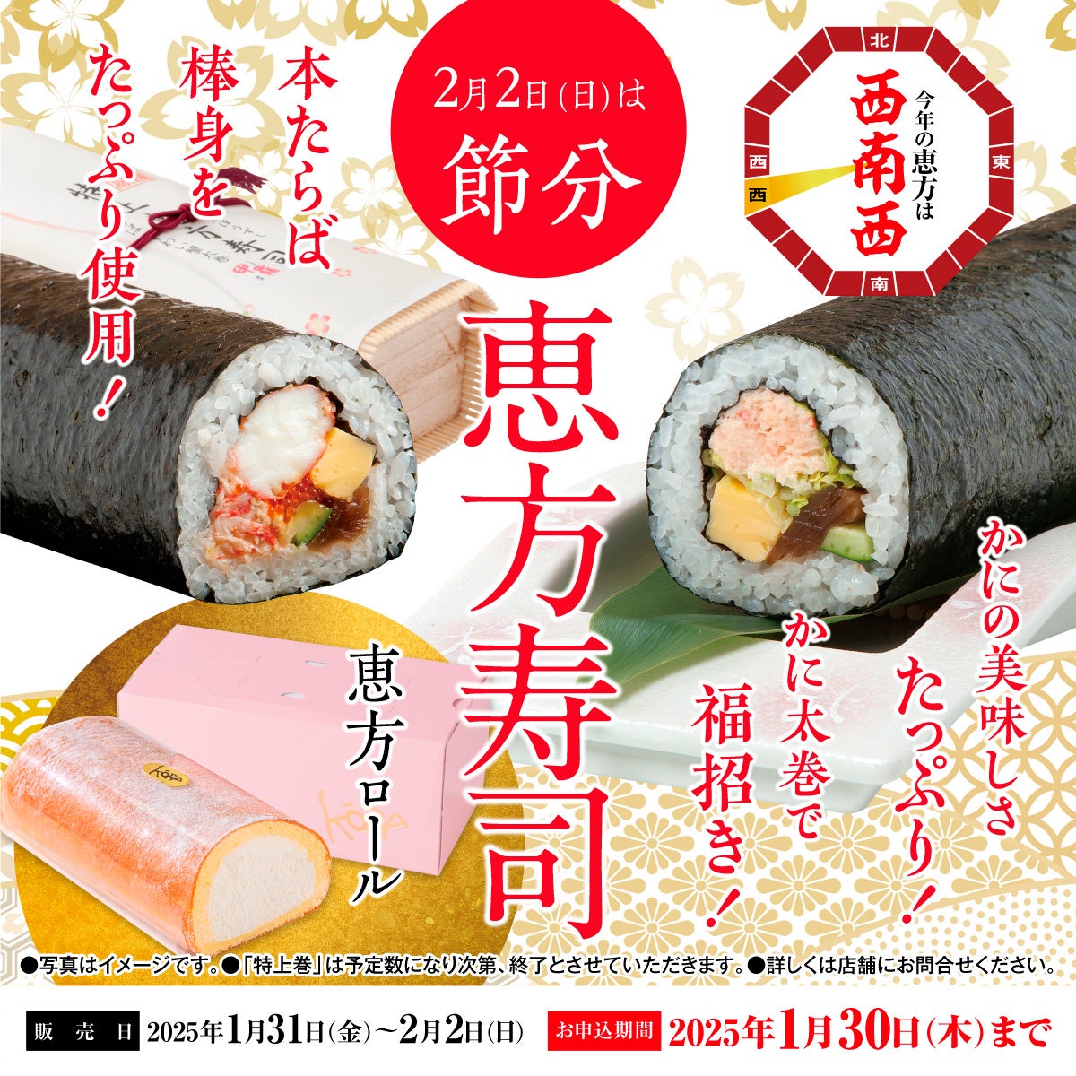 株式会社甲羅(本社:愛知県豊橋市、代表取締役:沼澤 裕)が全国で40店舗展開しているかに料理専門店「甲羅本店」では、今年も2月2日(日)の節分にあわせてご家庭用に「恵方寿司」の注文を受け付けています。本たらばをたっぷり使用した「特上巻」は数量限定となるのでご予約はお早めに。