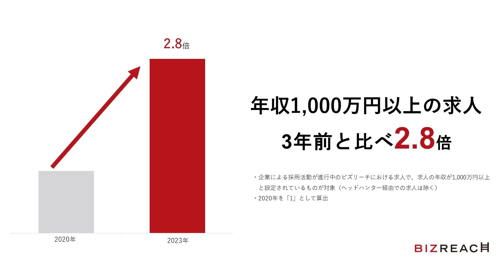 株式会社ビズリーチ(所在地:東京都渋谷区/代表取締役社長:酒井哲也)が運営する、即戦力人材と企業をつなぐ転職サイト「ビズリーチ」は、ビズリーチでの決定年収1,000万円以上の転職数が3年前と比べ、3.2倍に増加したことをお知らせします。また年収1,000万円以上の求人も増加傾向で、3年前と比べて2.8倍となり、変化の激しいビジネス環境を背景に、自社にない専門性や高いスキルを持った即戦力人材を外部から採用しようとする動きが高まっていることがわかりました。