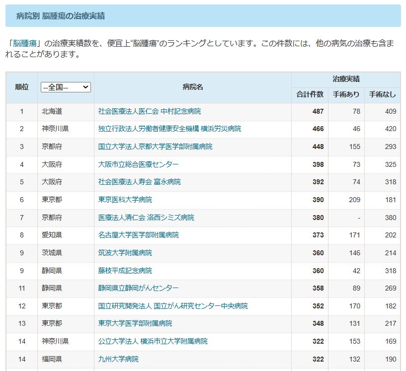 また特定の病院がどの治療・手術をどの程度行っているか、さらにそれが全国・県内で何位か、といった詳細情報まで確認が可能。