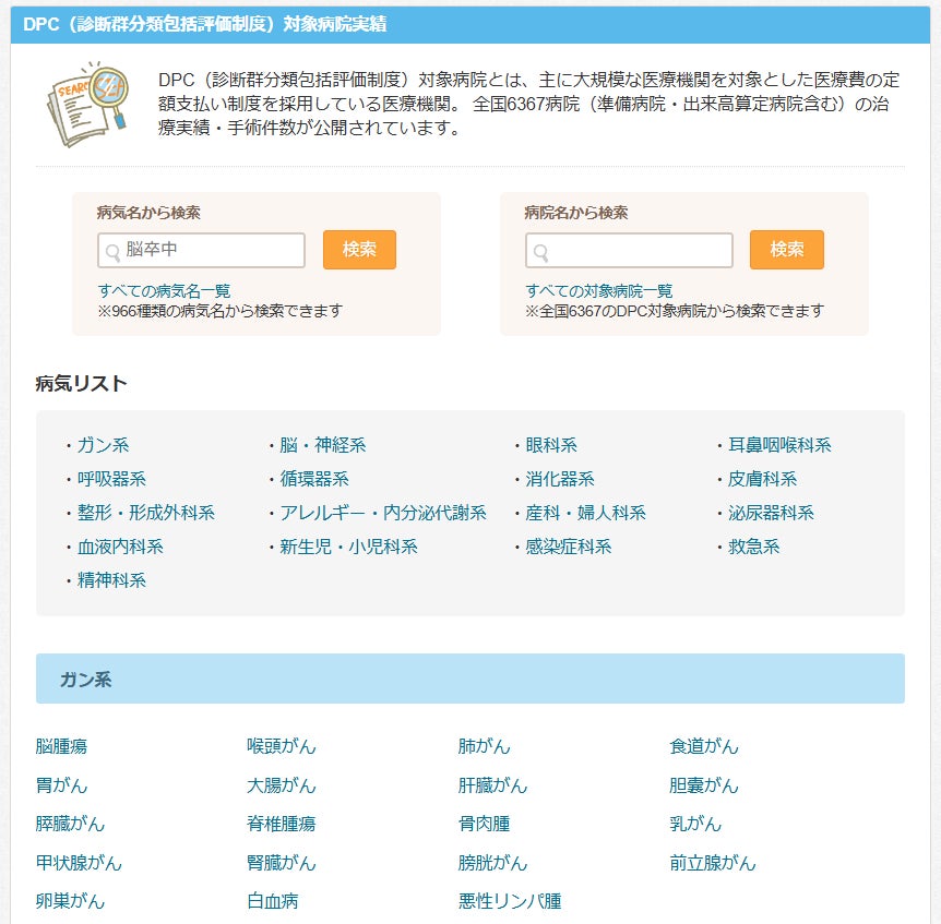 DPC対象病院実績(全国病院別治療実績検索):https://caloo.jp/achievements/