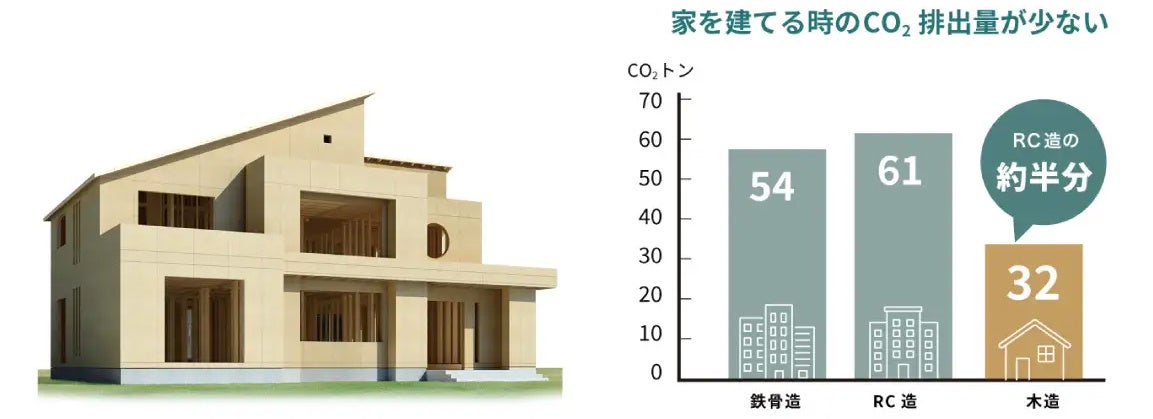 木造住宅は鉄骨造やRC造よりも建設時のCO2排出量が少なく環境負荷が低い上、2×6工法は木造住宅の中でも最も木材の使用量が多く、森林の適切な活用・保全のサイクルにも貢献します。