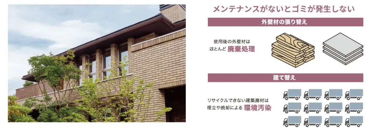 タイルは劣化や退色がほとんどなく耐久性や耐候性に非常に優れ、建物を永く守り続けます。また、タイルはメンテナンスの必要性が少なく、外壁材の交換や建て替えを抑え、ゴミの排出を減らすことができます。さらに、外壁メンテナンスに使用する塗料には揮発性有機化合物(VOC)が含まれ、地球温暖化の要因となるほか、CO2排出にも繋がります。ウィザースホームは、環境に優しい暮らしのためにタイルを採用しています。