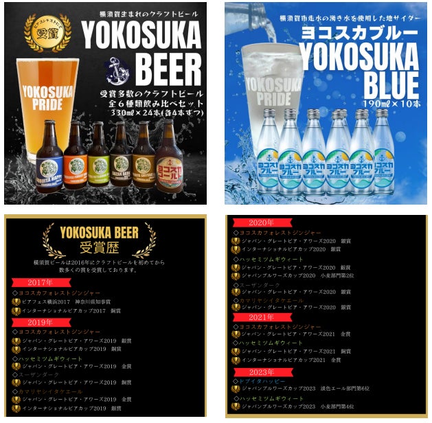 横須賀ビールは、横須賀・三浦半島の素材にとことんこだわったビールづくりで、のどごしスッキリ!美味しさピカイチ!嬉しい飲み比べセットで、味の違いや香りを楽しむのもアリ!ヨコスカブルーは、横須賀銘水「走水の湧水」を使用した天然水サイダーで、そのシュワシュワとした爽快感とスッキリした甘さは、子供からご年配の方まで幅広く愛されています!どんなシチュエーションでもお楽しみいただけます、是非♪