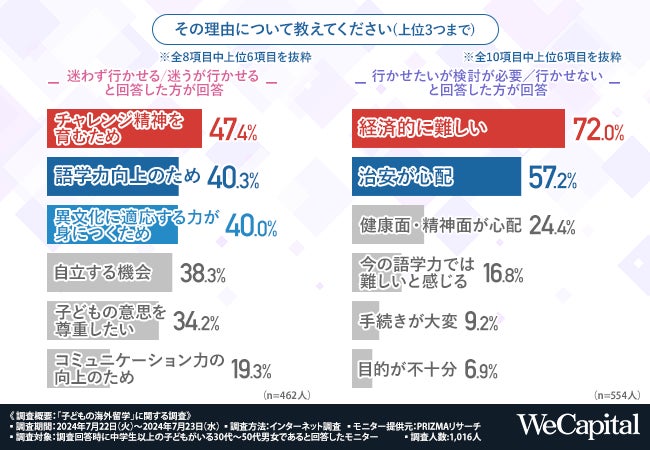 続いて、反対に「行かせたいが検討が必要」「行かせない」と回答した方に、「その理由について教えてください(上位3つまで)」と質問したところ、『経済的に難しい(72.0%)』が最も多く、『治安が心配(57.2%)』『健康面・精神面が心配(24.4%)』と続きました。