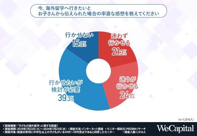 『ヤマワケ』(https://yamawake.jp/)の運営会社であるWeCapital株式会社(本社所在地:東京都港区、代表取締役:松田 悠介/橋口 遼)は、中学生以上の子どもがいる30代~50代男女の合計1,016人を対象に、「子どもの海外留学」に関する意識調査を実施しました。