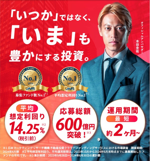 (*2)「ヤマワケエステート」が取り扱う商品は、元本が保証されているものではなく、投資対象となる匿名組合財産の価値の低下等により、お客様が出資した元本の損失が生じる可能性があります。各商品に係る手数料並びにリスク等の内容や性質は投資対象の商品毎に異なりますので、投資の判断はご自身で行うようお願いいたします。