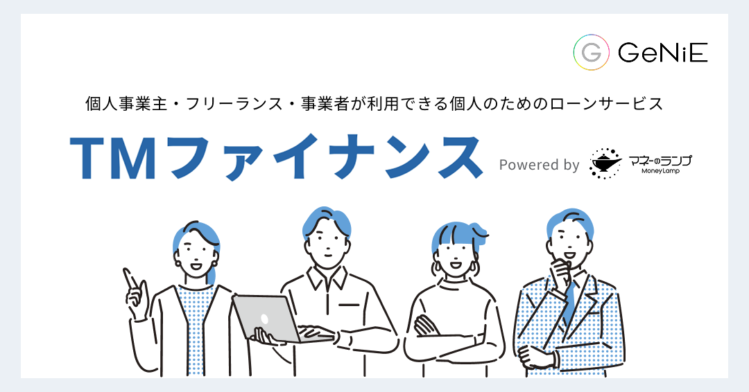 「マネーのランプ」は、GeNiEのレンディング機能を、提携先が展開するサービスに組み込んで提供する金融サービスです。GeNiEとトップ・マネジメントの提携においては、サービス名を「TMファイナンス」と銘打ち、トップ・マネジメントのファクタリングサービス利用者様に対し、個人向けローンサービスを提供いたします。