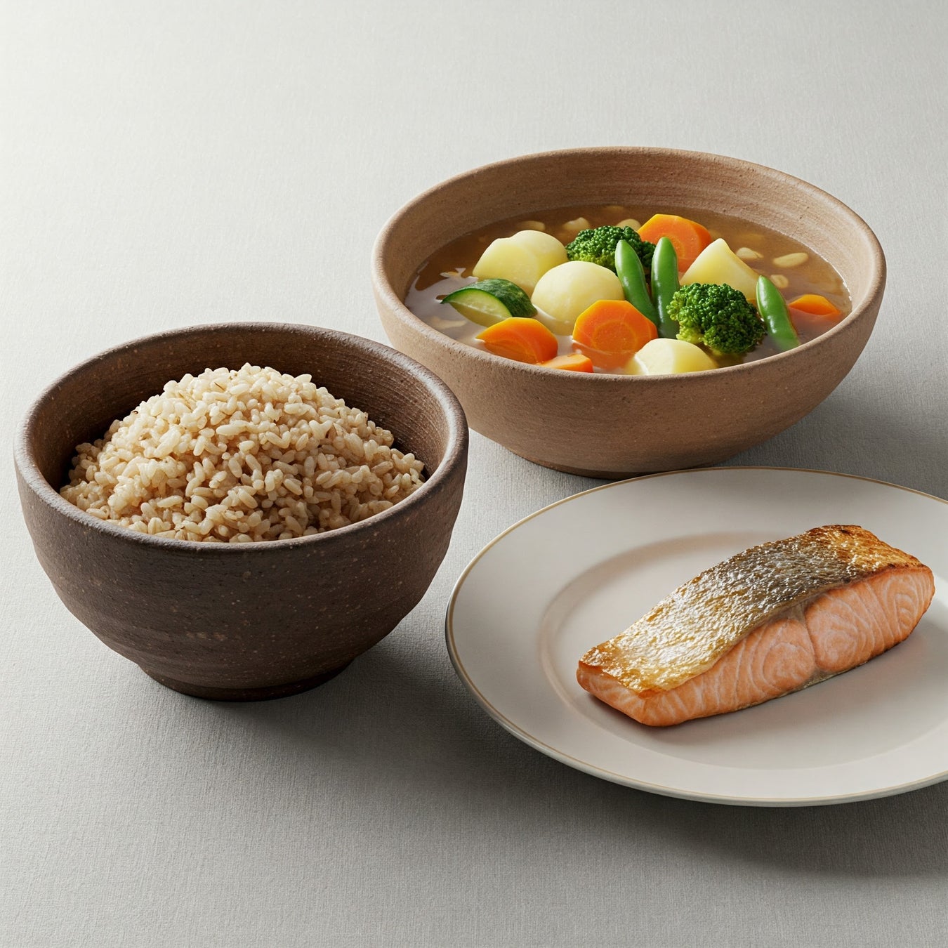 夕食セット:焼き魚、玄米おにぎり、野菜スープ