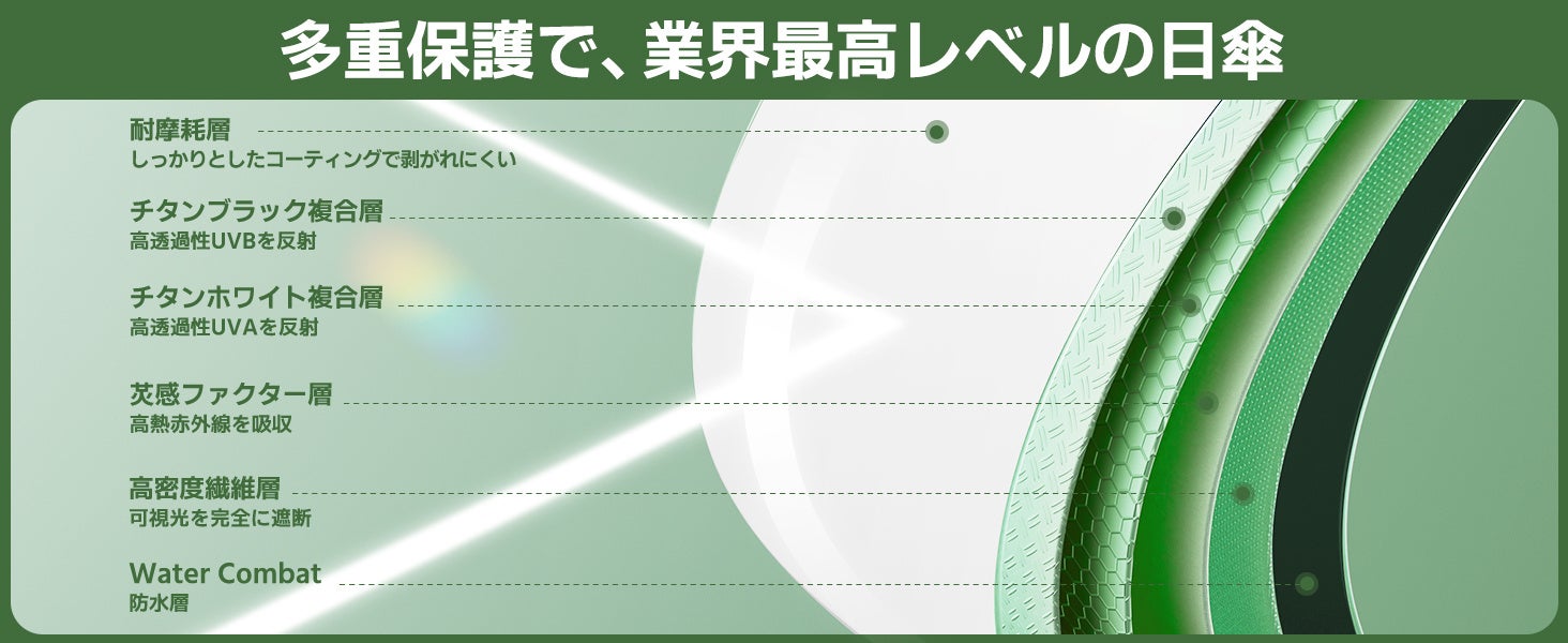 Alwgreenの日傘は、ドイツ製の高品質な生地を使用し、100%の完全遮光・遮熱性能を実現しています。JISの専門認証を受け、基準を100倍以上も上回る遮光効果とUV0効果を提供。開いた瞬間から-15℃の冷却効果を発揮し、暑い夏の日差しから肌を守り、熱中症対策にも最適です。