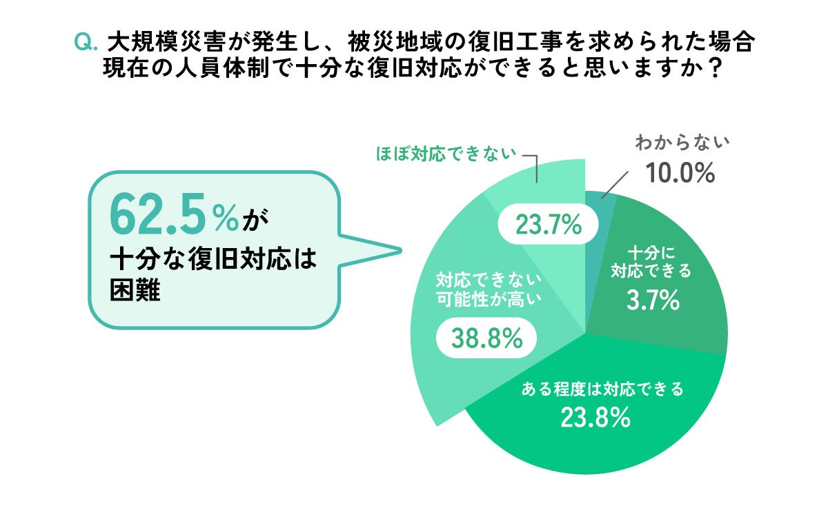 こうした人材構造の変化を踏まえ、「大規模災害が発生し、被災地域の復旧工事を求められた場合、現在の人員体制で十分な復旧対応ができるか」と尋ねたところ、6割以上(62.5%)が「ほぼ対応できない」「対応できない可能性が高い」と回答しました。