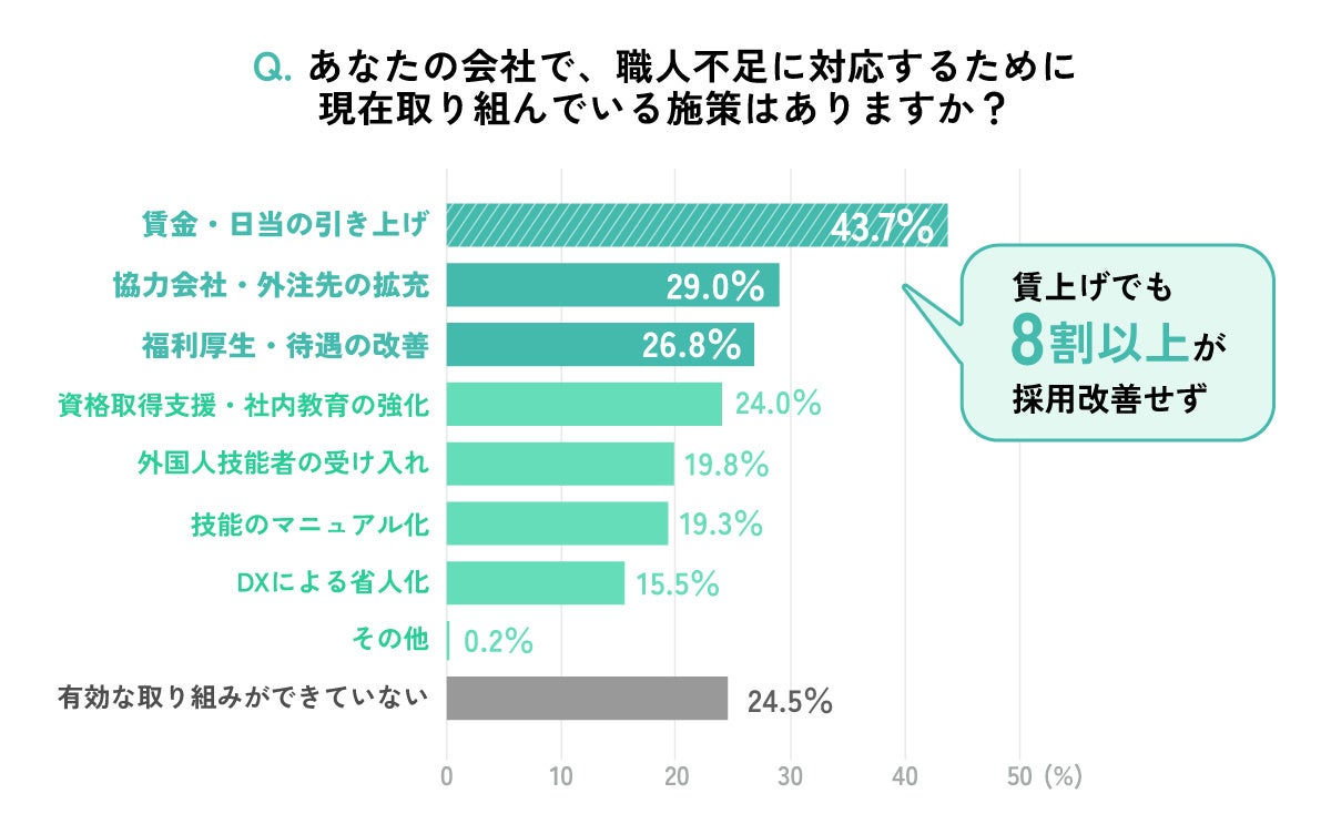 ・職人不足への対応策として最も多いのは「賃金・日当の引き上げ」(43.7%)。しかし、賃上げ実施企業の8割以上(84.3%)が「採用は改善しなかった」と回答。
