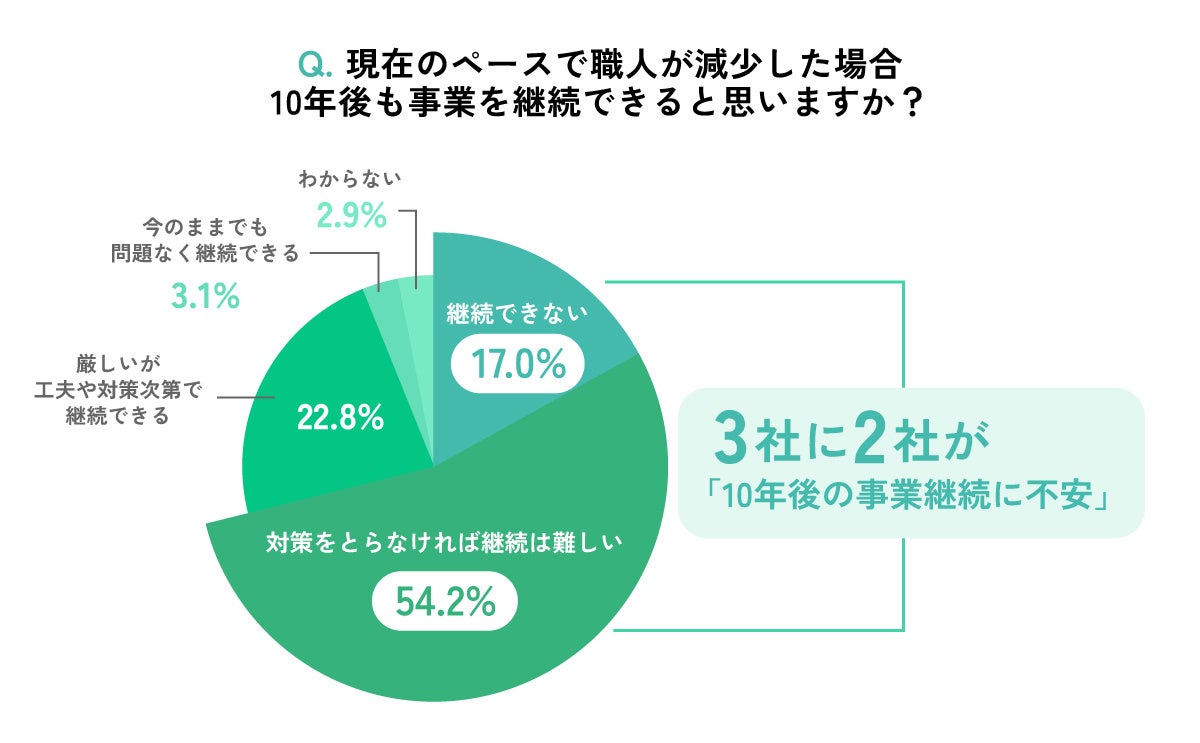 ・3社に2社以上(71.1%)が「現在のペースで職人が減少すれば10年後の事業継続は難しい」と回答。