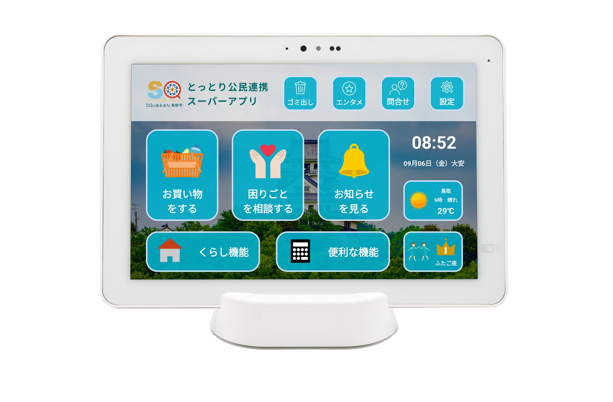 生活支援サービス「スーパーアプリ」では、当社の提供する専用タブレットから一括して様々な行政・民間のサービスが受けられます。日本海ケーブルネットワーク株式会社(代表取締役社長:吉岡徹)と株式会社鳥取テレトピア(代表取締役社長:秋山光行)が持つケーブルネットワークの通信インフラを活用し、市報の閲覧や電子図書館の利用、防災・交通情報の確認などの行政サービスに加え、アクシスが提供する日用品・食品等のネット注文サービス、新日本海新聞社の電子版新聞の閲覧をご利用いただけます。