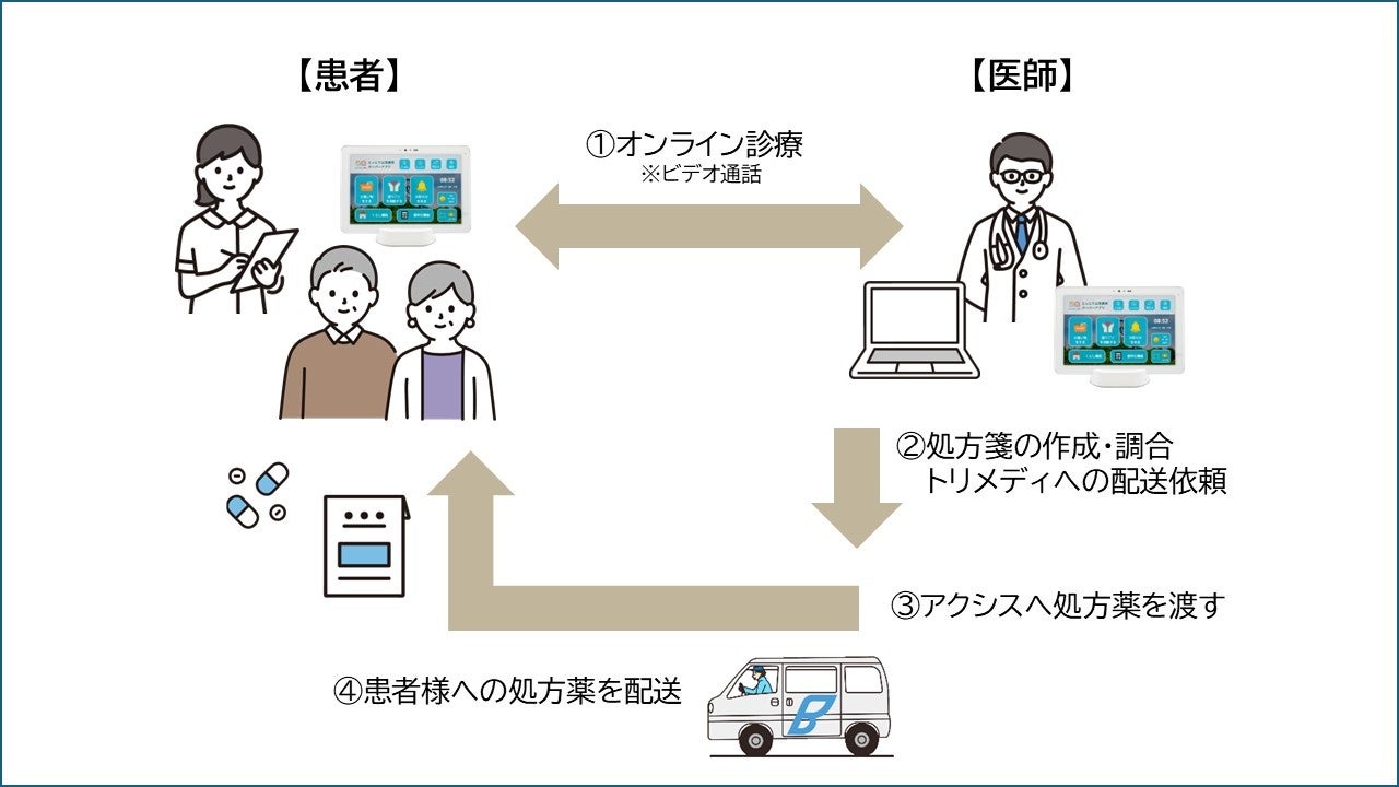 今回のオンライン診療の実証実験は、高齢化率が高い佐治町において、患者様の通院の軽減、利便性の向上、および地域医療サービスの安定的な確保を目的としています。当日は、佐治診療所で定期的に受診されている市民の方を対象とし、佐治町余戸公民館と佐治診療所に設置した当社タブレットを接続してビデオ通話によるオンライン診療を実施し、診療から処方薬の受け取りまで一気通貫した形式で行いました。