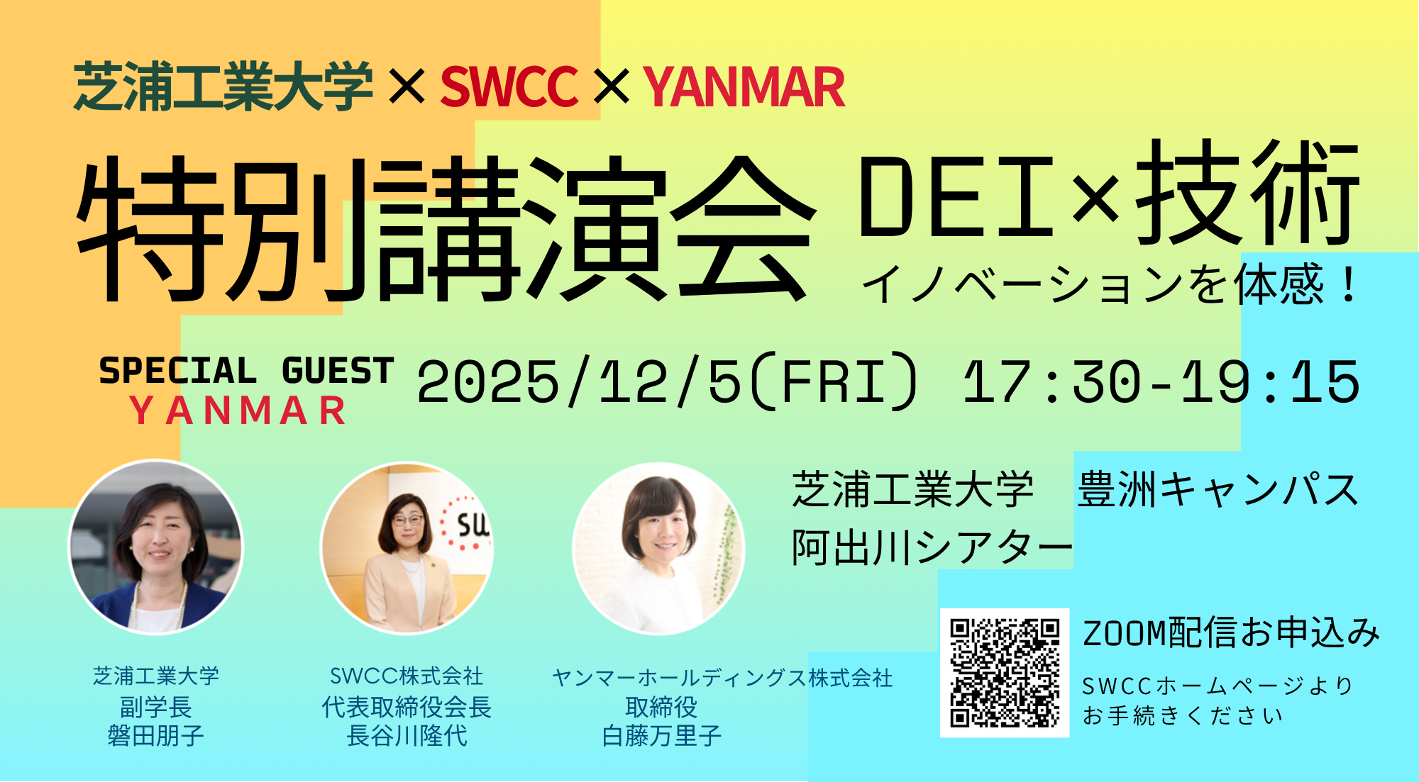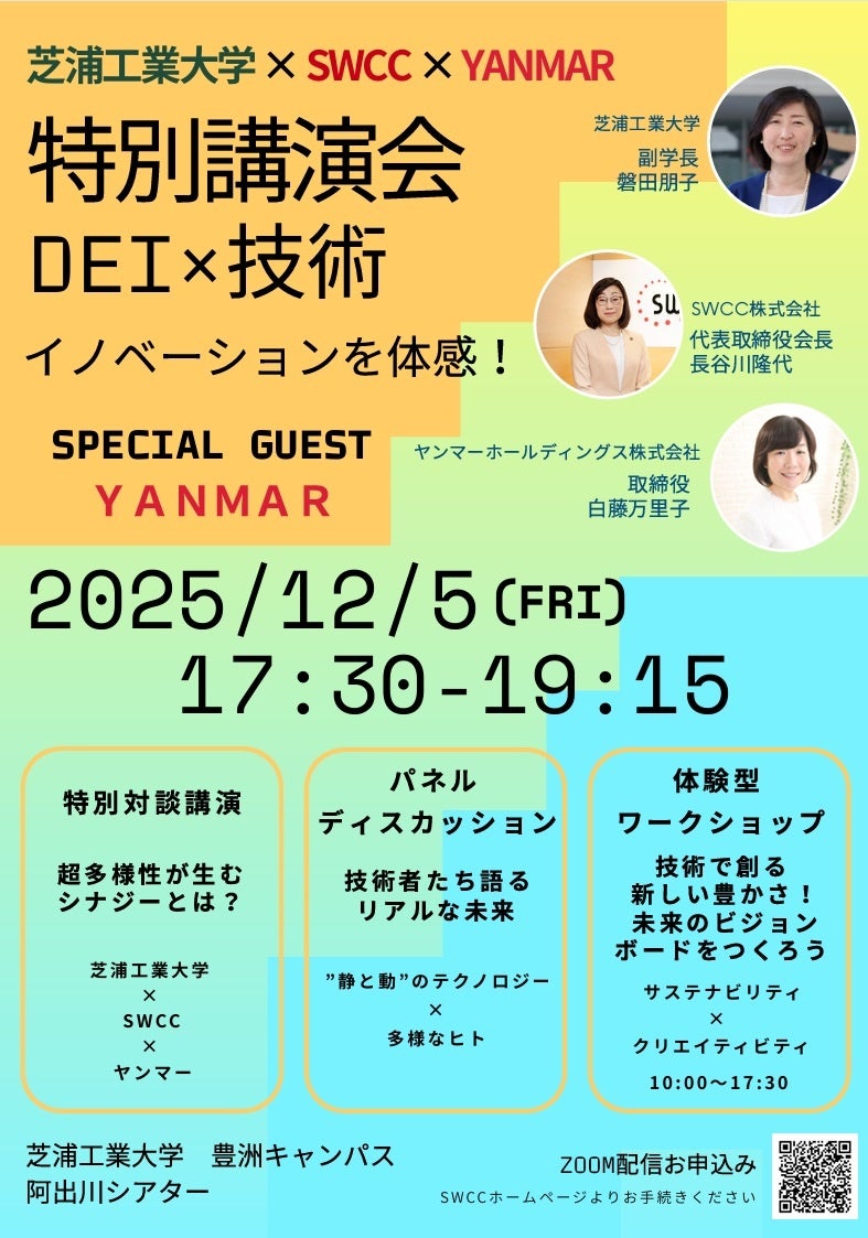 SWCC株式会社(神奈川県川崎市/代表取締役 CEO 社長執行役員 小又哲夫)と芝浦工業大学(東京都江東区/学長 山田純)は、芝浦工業大学豊洲キャンパスにてヤンマーホールディングス株式会社(大阪府大阪市/代表取締役社長 山岡健人)からゲストをお招きし、特別講演会:DEI×技術がイノベーションを創出することを体感しよう!「芝浦工業大学×SWCC×ヤンマーでシナジーを生む」を開催いたします。