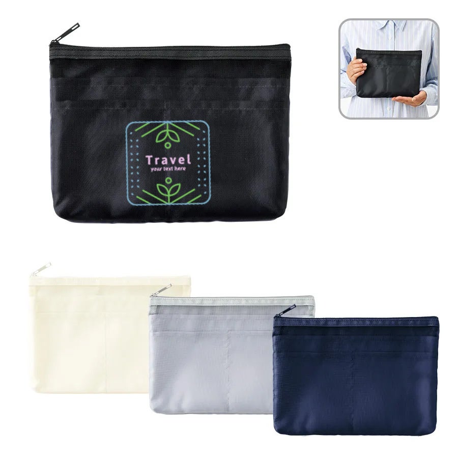 内側にメッシュ素材の仕切りを設けた、整理のしやすさが特徴のポーチです。ポケットは5個ついており、収納力に優れているため、スキンケアセットや充電ケーブルなどの小物をまとめて管理するのに適したサイズ感となっています