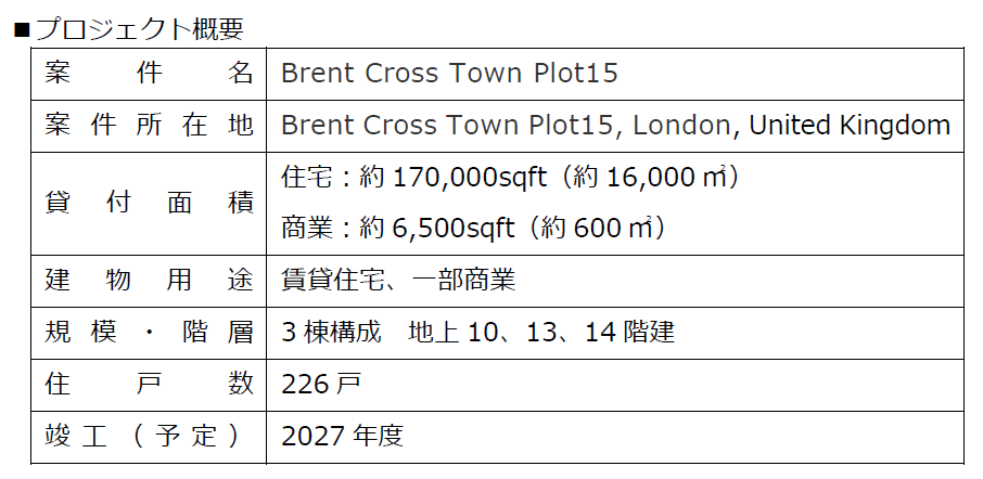 本プロジェクトは2023年12月に開業したブレントクロス・ウェスト駅から徒歩4分という立地を活かし、ワンルームから3LDKと幅広い間取りを提供することでロンドン中心部へ通勤・通学する単身世帯から家族世帯までをターゲットにしています。また、近隣マンションと共用部を相互利用可能とし、入居者にはプール・ラウンジ・ジム・シネマルームなど多種多様なアメニティを提供いたします。