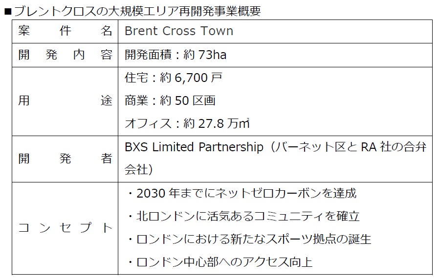 本プロジェクトはRA社と地元行政バーネット区が主導するロンドン・ブレントクロスの大規模エリア再開発事業(ブレントクロスタウン)における先行開発区画の一部を構成しております。事業パートナーのRA社はロンドン・キングスクロスの再開発で知られ、街づくりを通して地域社会の発展と社会的課題の解決に貢献しており、環境やウェルビーイングを重視している当社との親和性が高いことから、中長期的な協業やシナジーの発揮が期待されます。
