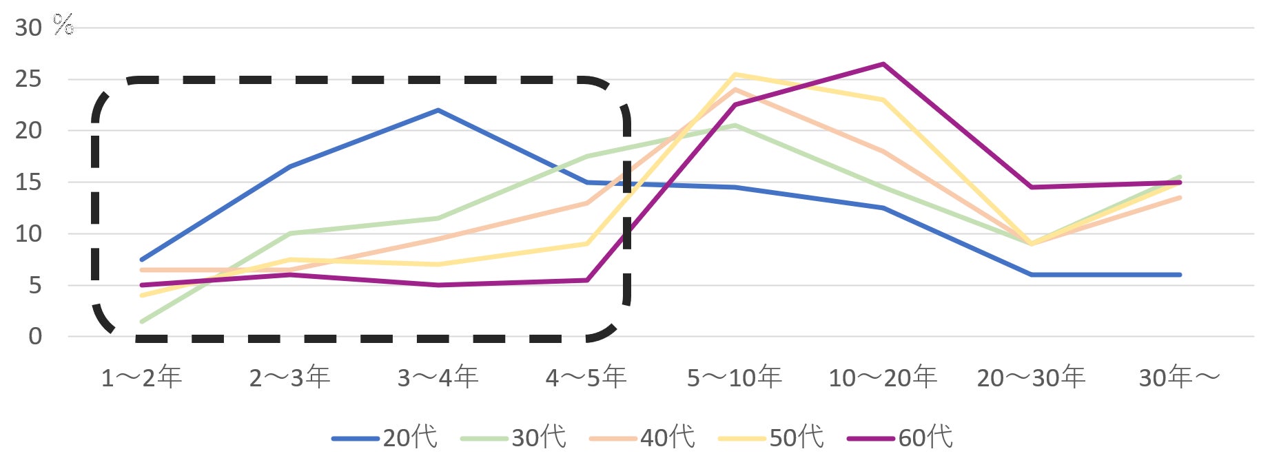 20代の個人は1~4年の比率が高く、60代はこの期間の比率は低く更に長期の投資を想定している。