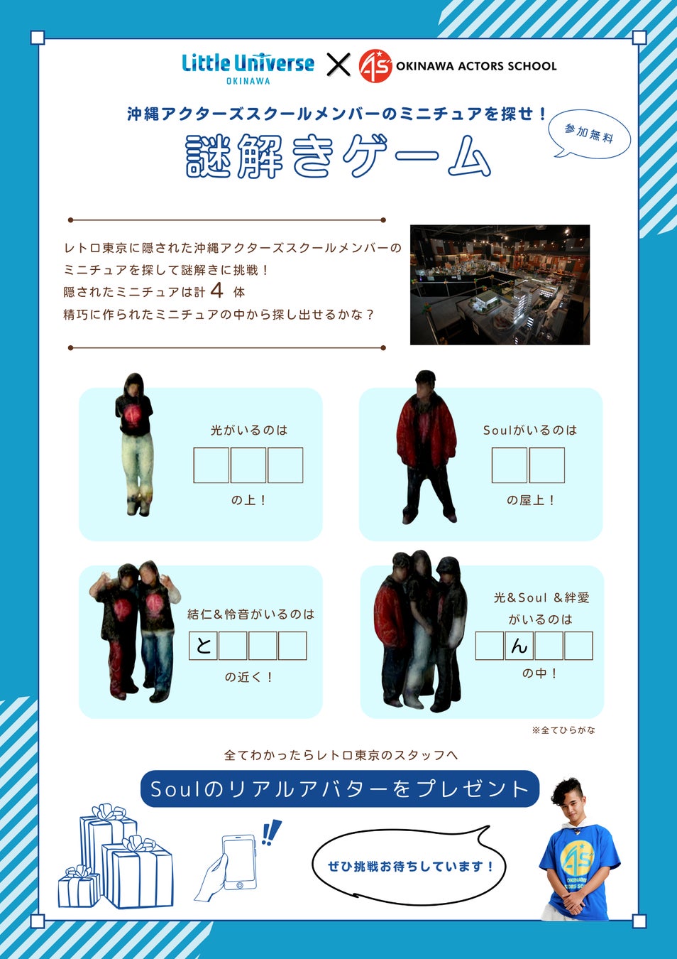 ミニチュアエリア「レトロ東京」に隠された沖縄アクターズスクールメンバーのミニチュアフィギュアを探す謎解きに挑戦。入場時に貰うシートを持ち、精巧に作られたミニチュアエリア内から約2cmの小さなメンバーのフィギュアを探し出して謎解きゲームをクリアしよう!クリアすると全員に「Soul」のリアルアバターをプレゼント。