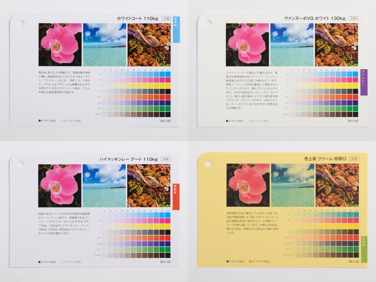 これまで、オフセット印刷でしかご注文いただけなかった「ホワイトコート」や「ヴァンヌーボVGホワイト」、「ハイマッキンレー ポスト/アート」、「色上質 最厚口」など、120種(※1)以上の用紙がオンデマンド印刷の少ない部数でもご注文可能になりました。