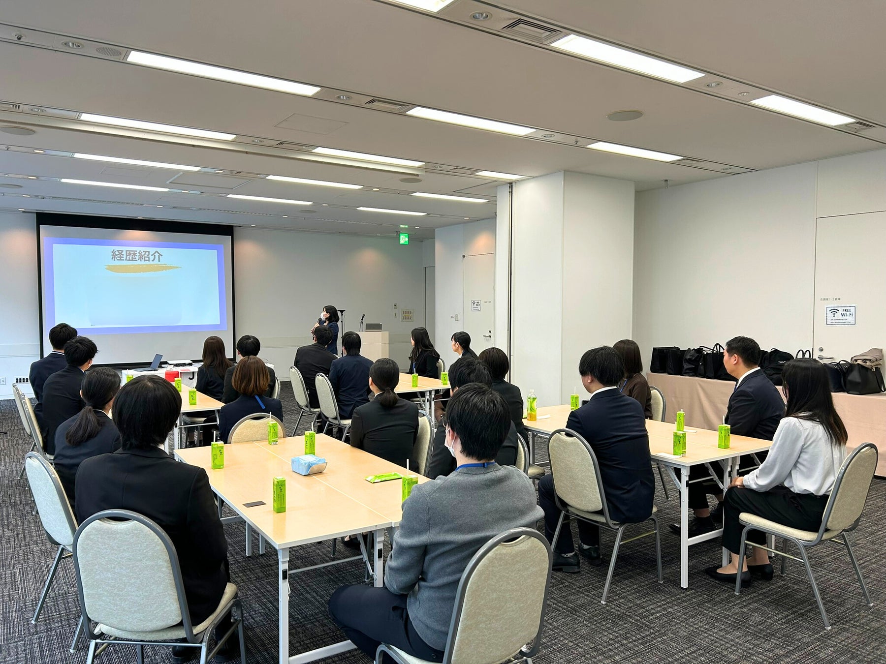 内定者と既存社員による懇親会を実施しました。昼食の後は、スライドを用いた自己紹介や仕事紹介を行いました。式典とは変わり、緊張感が少し和らいだ雰囲気の中で交流ができました。内定者たちは今後同期となる仲間や、入社後に共に働く先輩社員との親睦を深め、入社への期待を一層高める貴重な時間となりました。