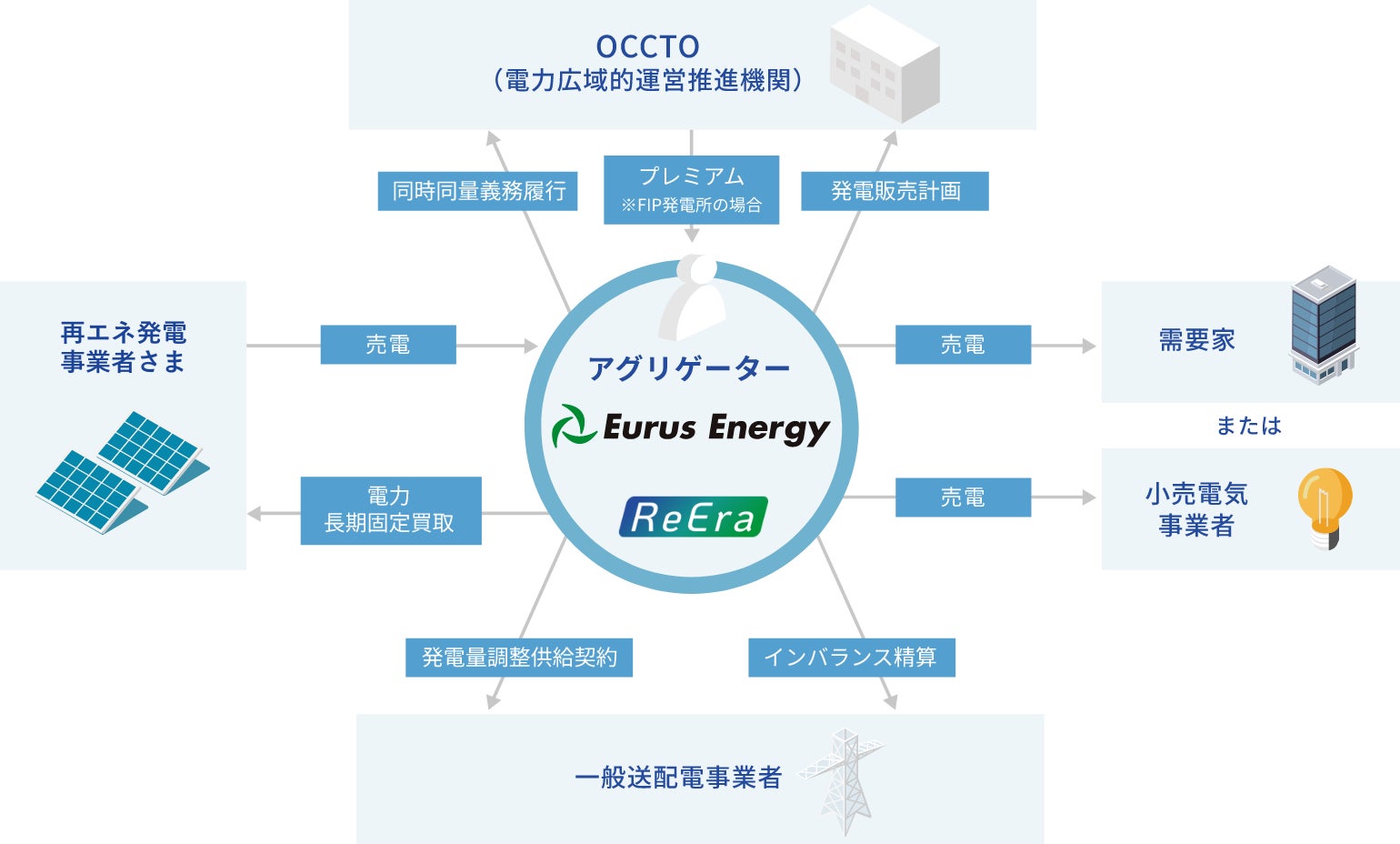 ・再エネ電力の引き受け(買取/販売代行) ・発電販売計画の策定・提出 ・インバランス精算 ・電力需要家や小売電気事業者、卸電力市場への販売 など |