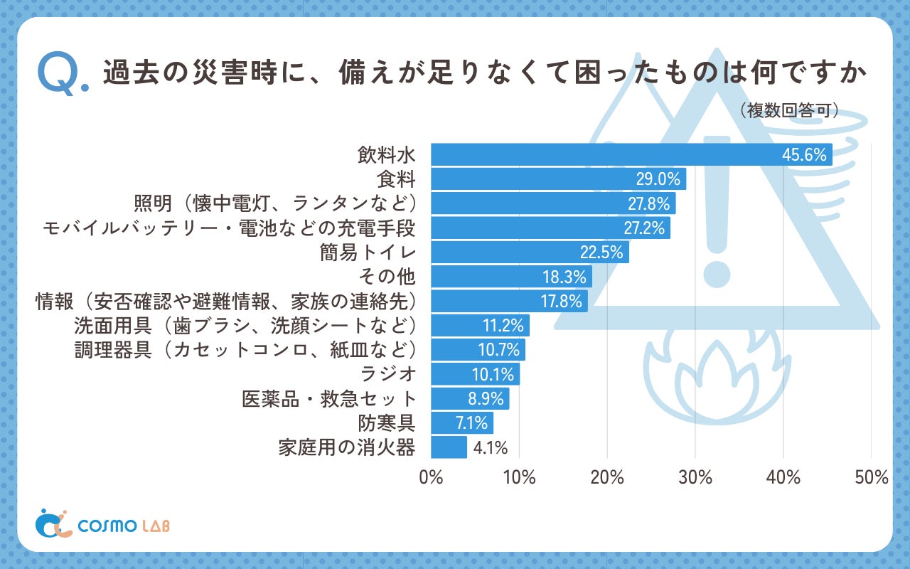 被災時に最も困ったのは「飲料水」(45.6%)で、命をつなぐ最も基本的な資源が不足していた実態が明らかになりました。次いで「食料」(29.0%)、「照明(懐中電灯、ランタンなど)」(27.8%)と続き、生命維持と安全確保に関わる基本的アイテムへのニーズが高いことが分かります。これらの結果から、災害時にはまず「飲む」「食べる」「見る」という基本的な機能の維持が最優先課題であることが浮き彫りになっています。