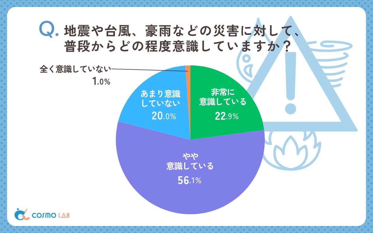 シニア層の災害意識は極めて高く、「やや意識している」(56.1%)と「非常に意識している」(22.9%)を合わせると79%に達します。一方、「あまり意識していない」(20.0%)層も一定数存在する反面、「全く意識していない」は1.0%とごく少数です。