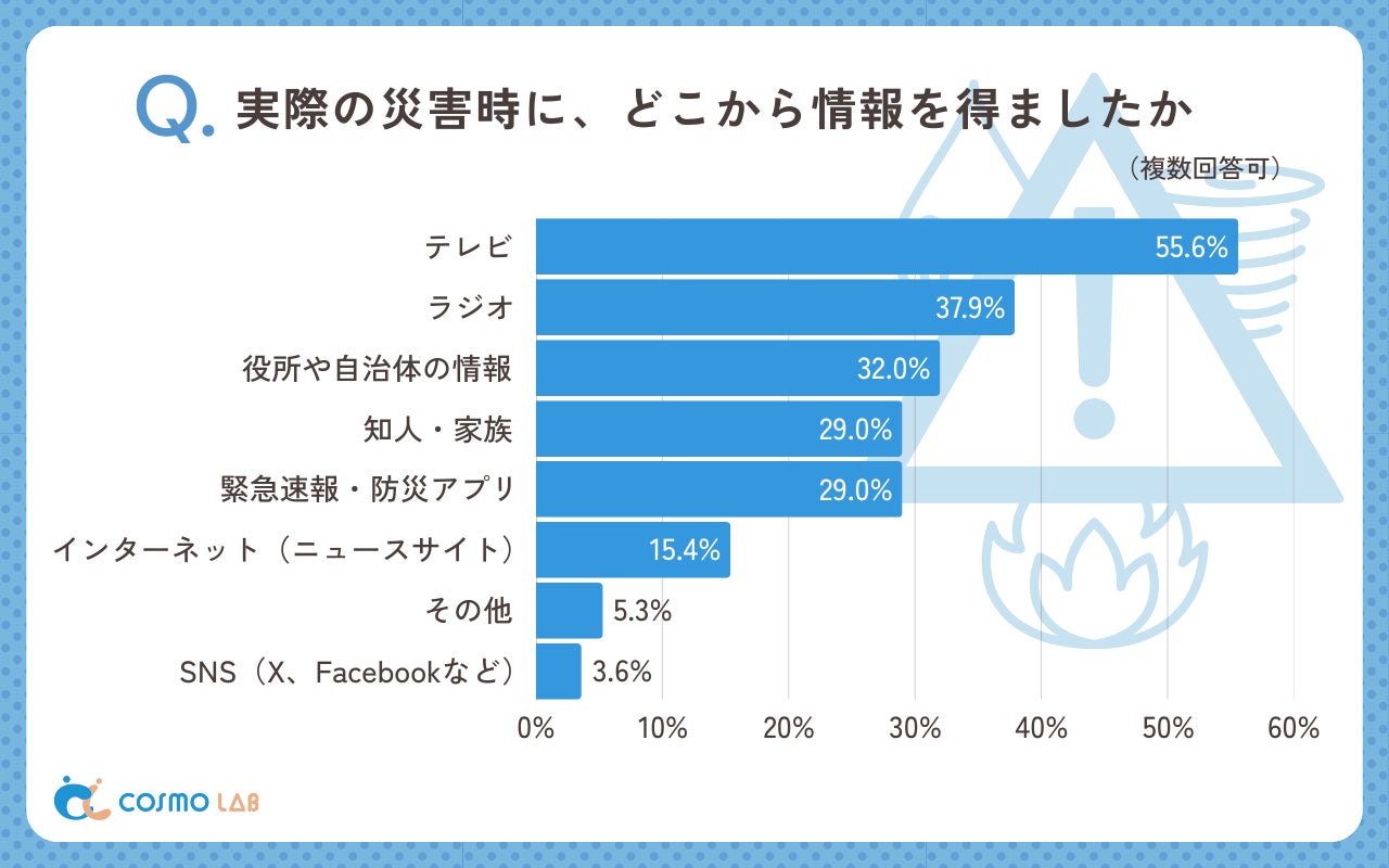 被災経験者の情報源は「テレビ」(55.6%)が最多で、「ラジオ」(37.9%)、「役所や自治体の情報」(32.0%)が続きます。災害時においても従来型メディアが重要な情報インフラとして機能しており、多様な情報チャネルの確保が重要であることが分かります。