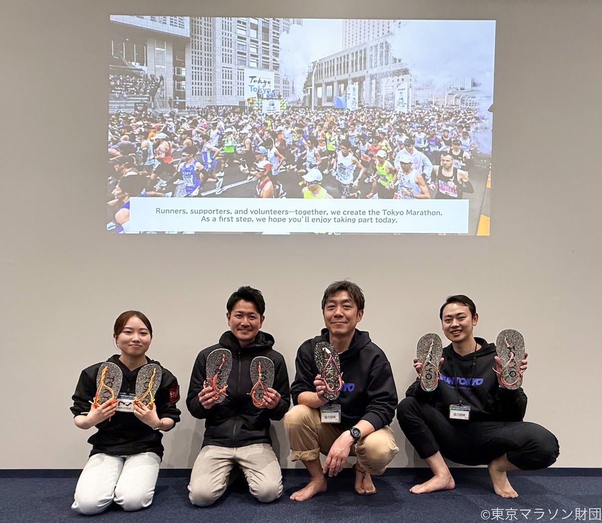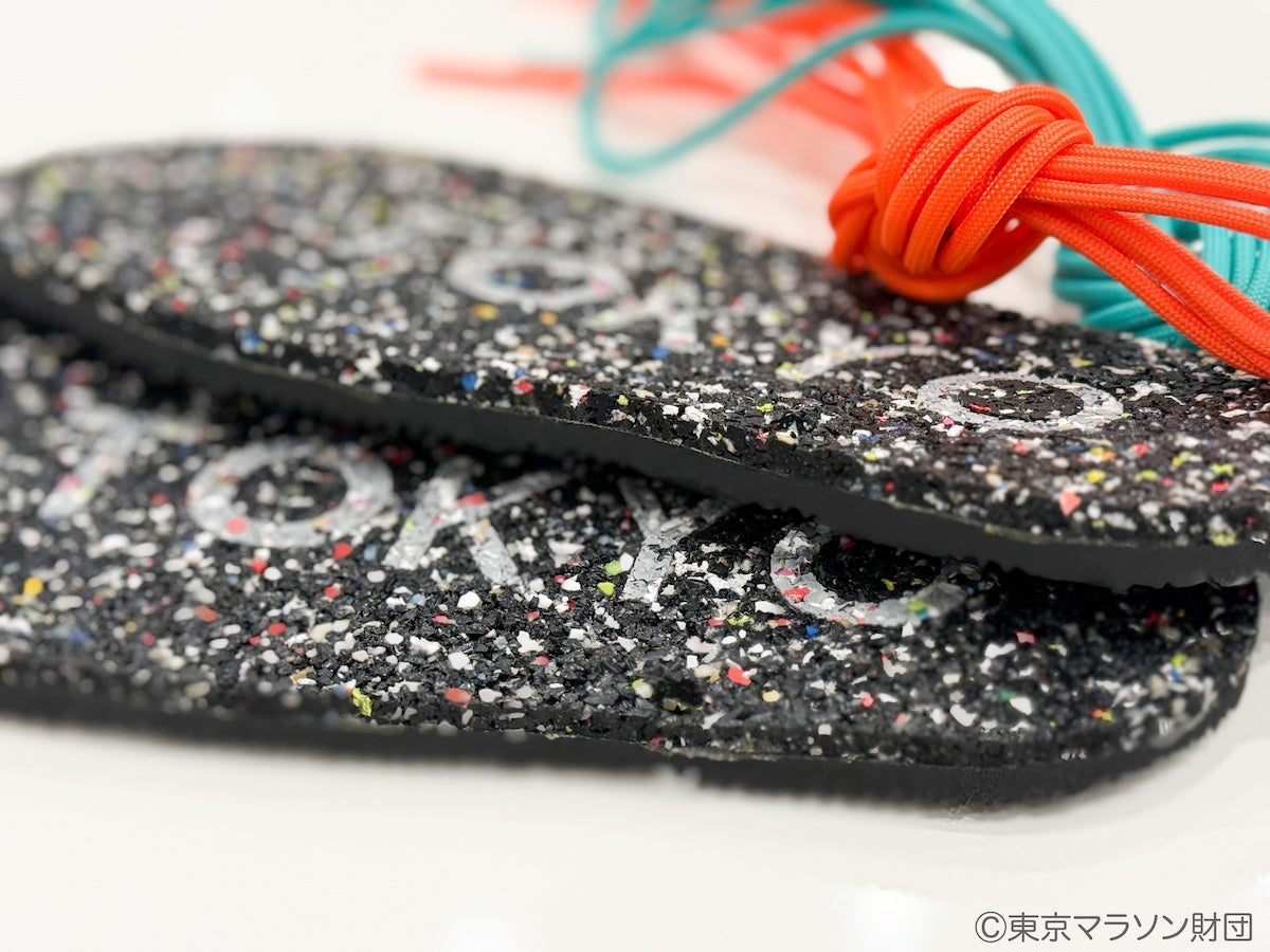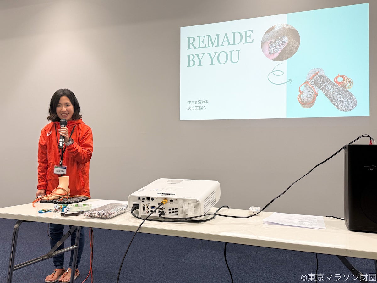 参加者は、細かく粉砕されたシューズのソール(廃材)が再び成形され、新たな価値を持つサンダルへと変わるプロセスを学びました。また、タグ部分は東京マラソン2025(前回大会)で関係者が使用していたネックストラップをアップサイクルして使用するなど、素材の有効活用を徹底しています。